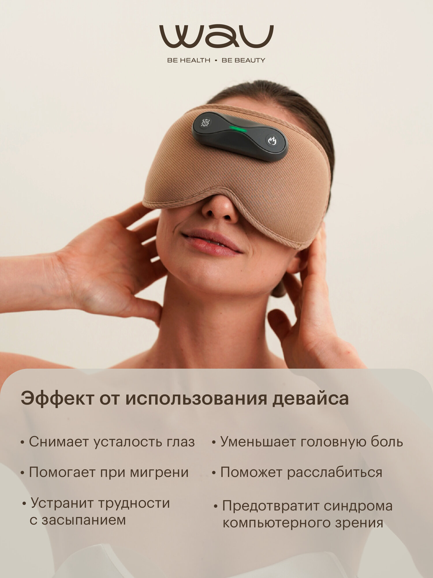 Массажные очки для глаз помогут расслабить мышцы, усилить циркуляцию крови и снять напряжение в зоне вокруг глаз. 8 режимов, работающих независимо друг от друга, комбинируются между собой, что позволит подобрать оптимальный вариант. Маска для глаз согревающая: 3 режима нагрева могут сочетать с функцией вибрации, а могут прогреть мышцы глаз для расслабления и релаксации без дополнительных воздействий. От головной боли и от мигрени пригодится функция охлаждения: благодаря вкладышу для холодного компресса, можно уменьшить приток крови. Если в сочетании с охлаждающей маской включить режим вибрации, это снизит болевые ощущения и расслабит глазные мышцы — это поможет избавиться от отёков. При работе за компьютером или чтении, массажер для лица снизит усталость глаз и предотвратит развитие синдрома компьютерного зрения. Маска на глаза создаст атмосферу релаксации и умиротворения, что важно после рабочего дня или в стрессовых ситуаций. Повязка на глаза поможет от бессонницы: не только расслабит мышцы глаз, но и создаст полный блэкаут, улучшая качество сна и уменьшая стресс. Маска для глаз от усталости ELAX пригодится при аллергическом конъюнктивите: охлаждение глаз снизит отечность и зуд в глазах при аллергическом конъюнктивите. А при ощущении сухости глаз режим нагрева увеличит выработку слезы, усилив естественную увлажненность глаза.