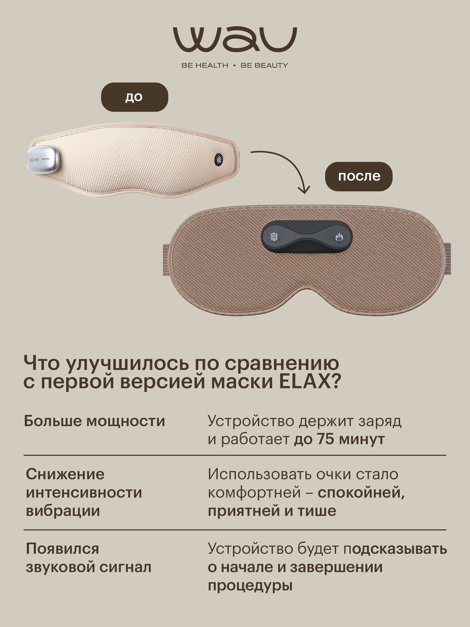 Массажная маска для глаз ELAX от WAU вышла в обновлённой версии, где были учтены пожелания и улучшены элементы по сравнению с массажными очками первой версии, а главное — сохранены преимущества.