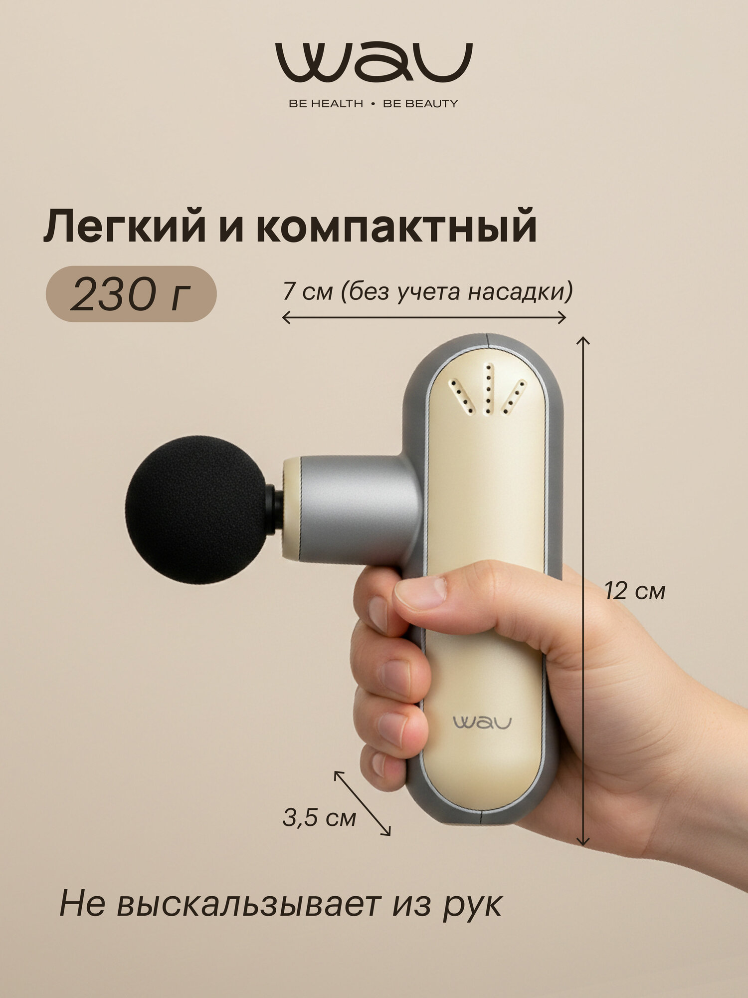 Компактная версия перкуссионного массажера для снятия напряжения и боли в мышцах, который можно использовать как антицеллюлитный массажер. Массажер пистолет весит всего 230 грамм и настолько миниатюрен, что уместится в ладони.