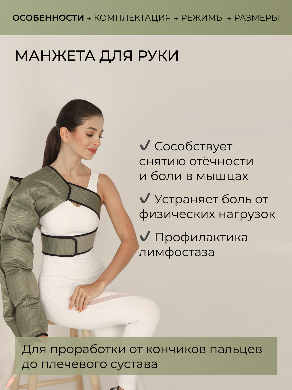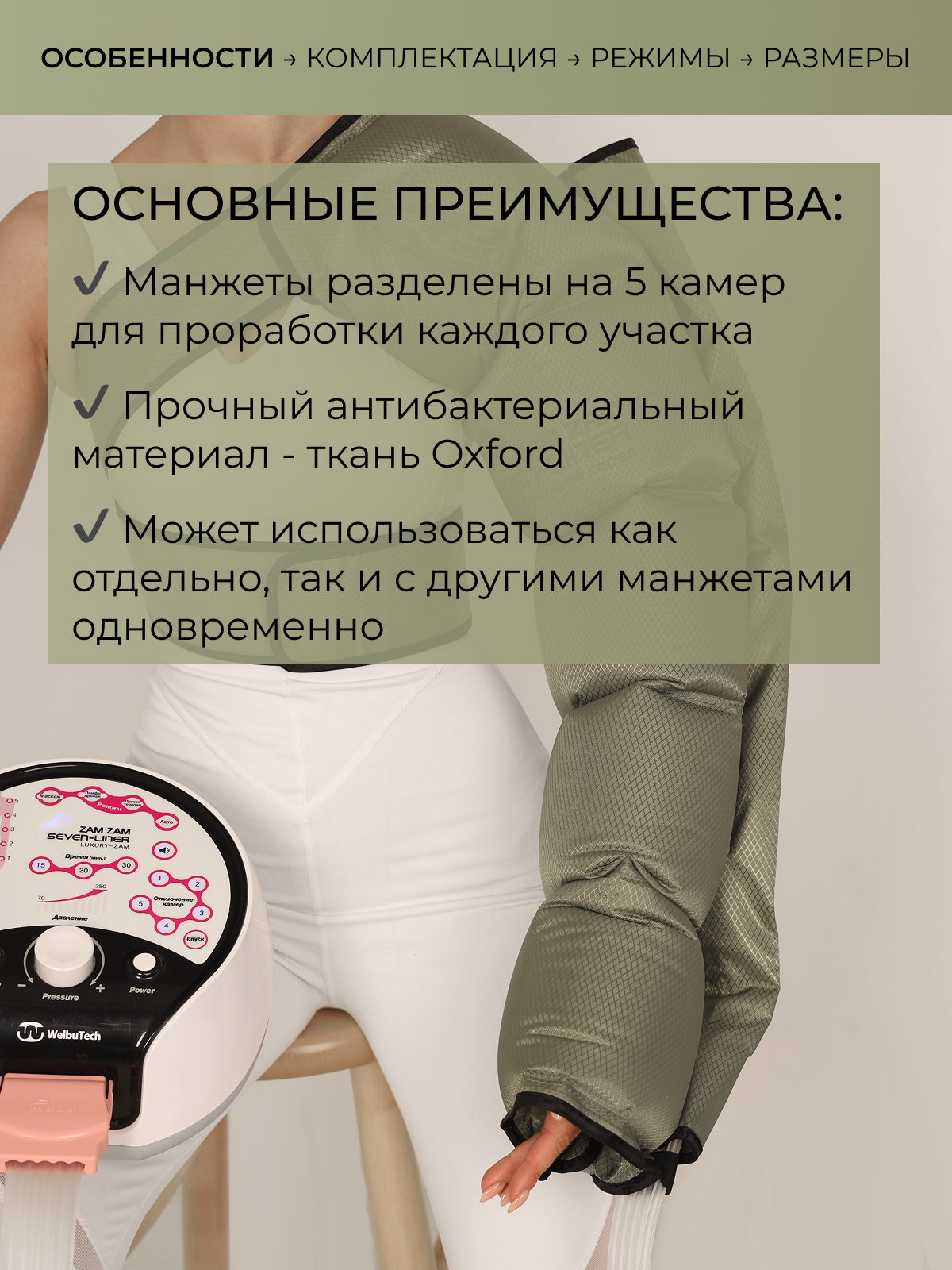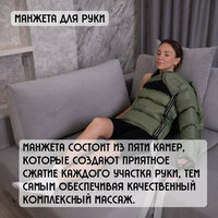 Она предназначена для точечной проработки каждого участка – от кончиков пальцев до плечевого сустава. Манжета состоит из пяти отдельных камер, которые, в зависимости от выбранного режима массажа, накачиваются в определённой последовательности.