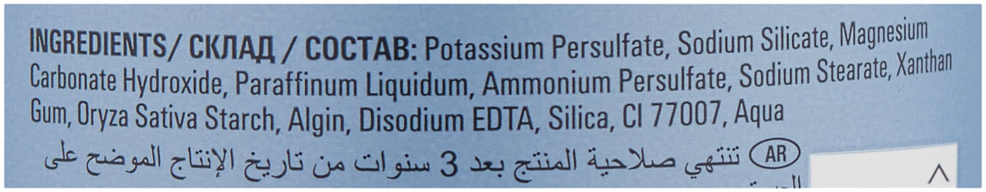 | Состав | Силикат натрия,гидроксид карбоната магния,жидкий парафин,персульфат аммония,стеарат натрия,ксантановая камедь,крахмал,динатрий ЭДТА,диоксид кремния,карбоната магния |