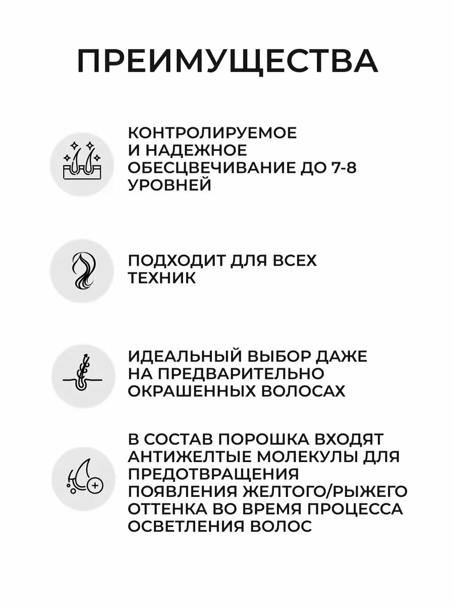 Максимальный уровень осветления на предварительно окрашенных волосах • Любимая продукция наших стилистов и бестселлер в линейке Blondor. • Контролируемое и надежное осветление до 7 уровней. • Подходит для всех техник осветления. • Идеальное осветление даже на предварительно окрашенных волосах. • Содержит специальные молекулы, позволяющие уменьшить проявление нежелательных оранжевых/желтых оттенков в процессе осветления.