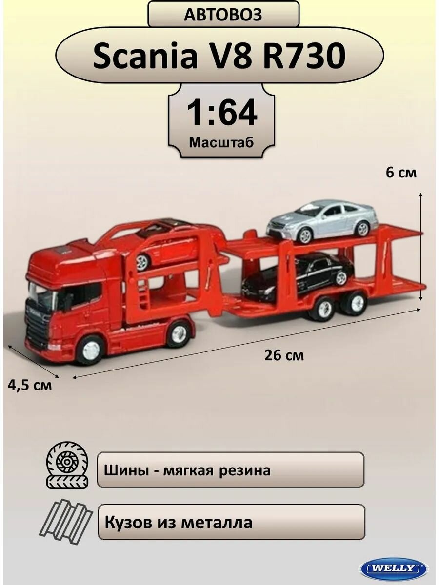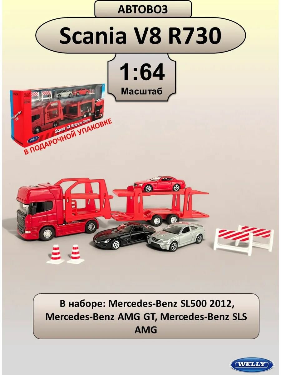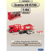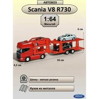 WELLY Набор машинок металлических коллекционная масштабная модель 1:64 Грузовик Scania V8 R730 с тремя легковыми машинками красный: сравнение цен, характеристики, фото, актуальное наличие и цены.