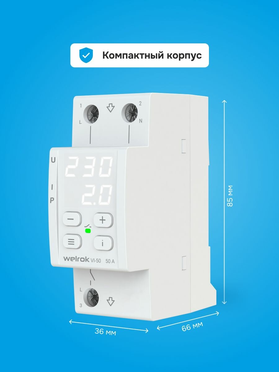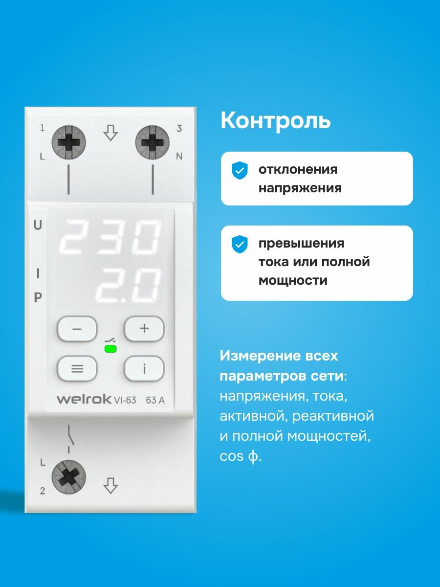 Реле напряжения с контролем тока Welrok VI-63 защищает оборудование от скачков и провалов напряжения, последствий обрыва нулевого провода и превышения тока или мощности. Реле отключает нагрузку, если напряжение, ток или мощность выходит за установленные пределы и автоматически включает нагрузку, когда значение параметра вернется в норму.