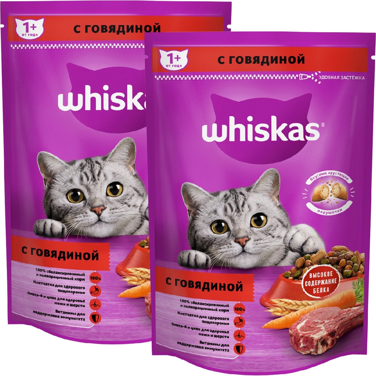 Вкусные подушечки с нежным паштетом - аппетитный обед с говядиной. Побалуйте своего питомца полноценным сухим кормом Whiskas для взрослых кошек! Это сбалансированный рацион для здоровой и счастливой жизни Вашей кошки. Хрустящие подушечки с нежным паштетом внутри обязательно придутся по вкусу Вашей любимице. Кроме того, Whiskas содержит все необходимое, чтобы еда Вашей кошки была не только вкусной, но и полезной. Рационы Whiskas содержат все необходимые витамины и минералы, белки, жиры и углеводы, чтобы поддержать здоровье Вашей кошки от усов до кончика хвоста.