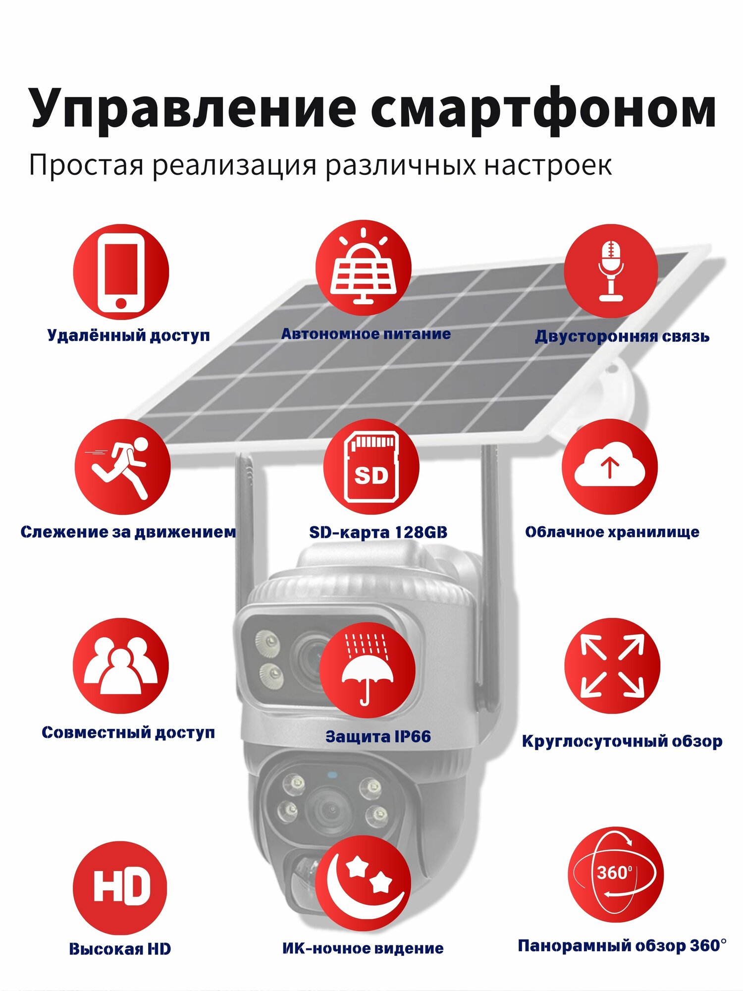 Солнечная камера с двойным обзором и интеллектуальным управлением! Главные преимущества: 1. Полная автономность 365 дней Солнечная панель обеспечивает непрерывную работу без подзарядки! Защита от дождя, грозы и экстремальных температур (-45°C ~ +50°C). 2. Двойные камеры — контроль всех зон 2 объектива с разрешением 2K (1920×2160) охватывают двор, вход, гараж одновременно. Двойной поток (основной + субпоток) — детализация и экономия памяти. 3. Умное управление через приложение Подключите несколько камер к одному приложению — контроль всего участка с телефона. Детекция движения, слежение за людьми и мгновенные уведомления. 4. Ночное видение и надежность 4 ИК-светодиода и 2 белых светодиода — четкое изображение до 15 метров даже в темноте. Водонепроницаемый корпус и защита от перепадов напряжения. 5. Wi-Fi и простая установка Беспроводное подключение (802.11b/g/n) — никаких проводов! Настенный монтаж и поворот 355° горизонтально/90° вертикально — обзор без слепых зон. Одно приложение для управления всеми камерами: настройка зон, просмотр в реальном времени, запись на карту 128 Гб. Солнце + Wi-Fi = вечная работа — идеально для дач, магазинов и складов. 2 камеры в одном — максимум функциональности по выгодной цене! Идеально для: Круглосуточной защиты дома, офиса, открытых территорий. Наблюдения за детьми, животными или периметром в любую погоду. умная безопасность без лишних затрат!