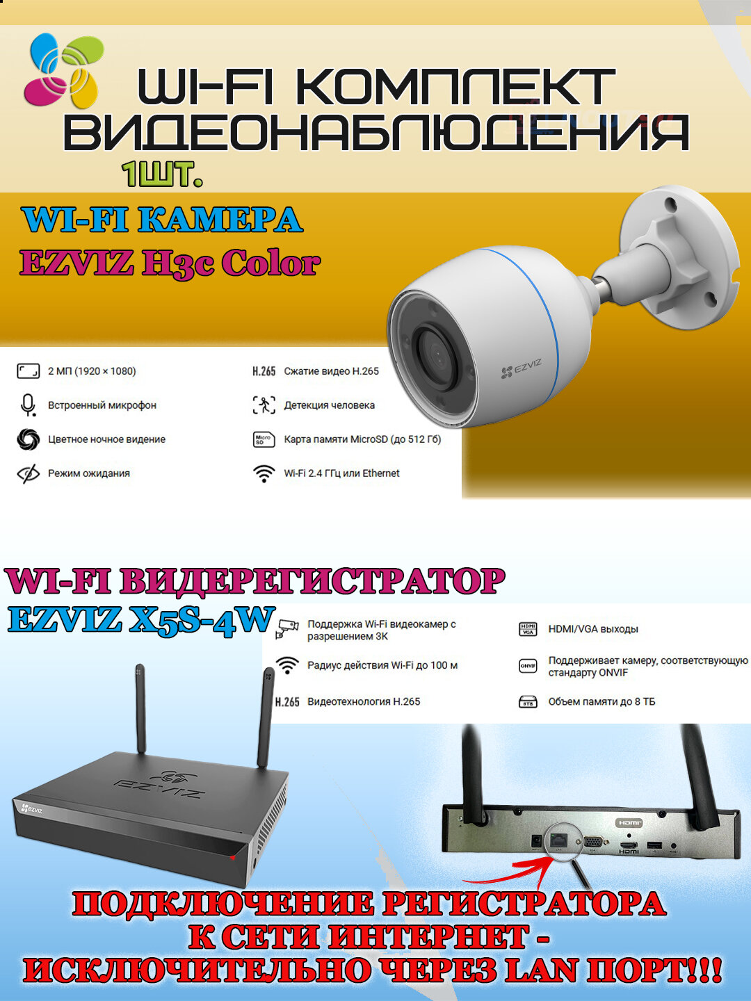 Wi-Fi Комплект видеонаблюдения EZVIZ на 1 видеокамеру - 2Мп 1080P (1хCS-H3c Color + CS-X5S-4W) Цветное ночное видение, IP67, ИК-подсветка до 30м, угол 125гр, H.265