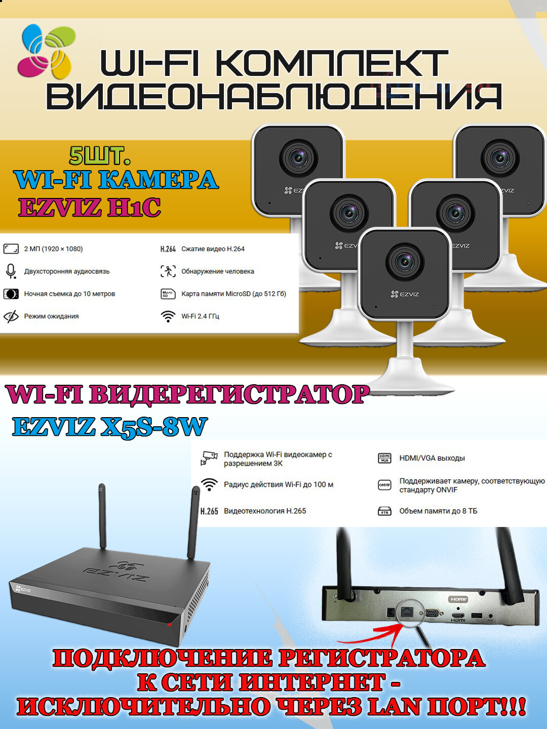 Wi-Fi Комплект видеонаблюдения EZVIZ на 5 видеокамер - 2Мп 1080P (5хCS-H1c + CS-X5S-8W) Двусторонняя аудиосвязь, ИК-подсветка до 10м, угол 108гр, H.265