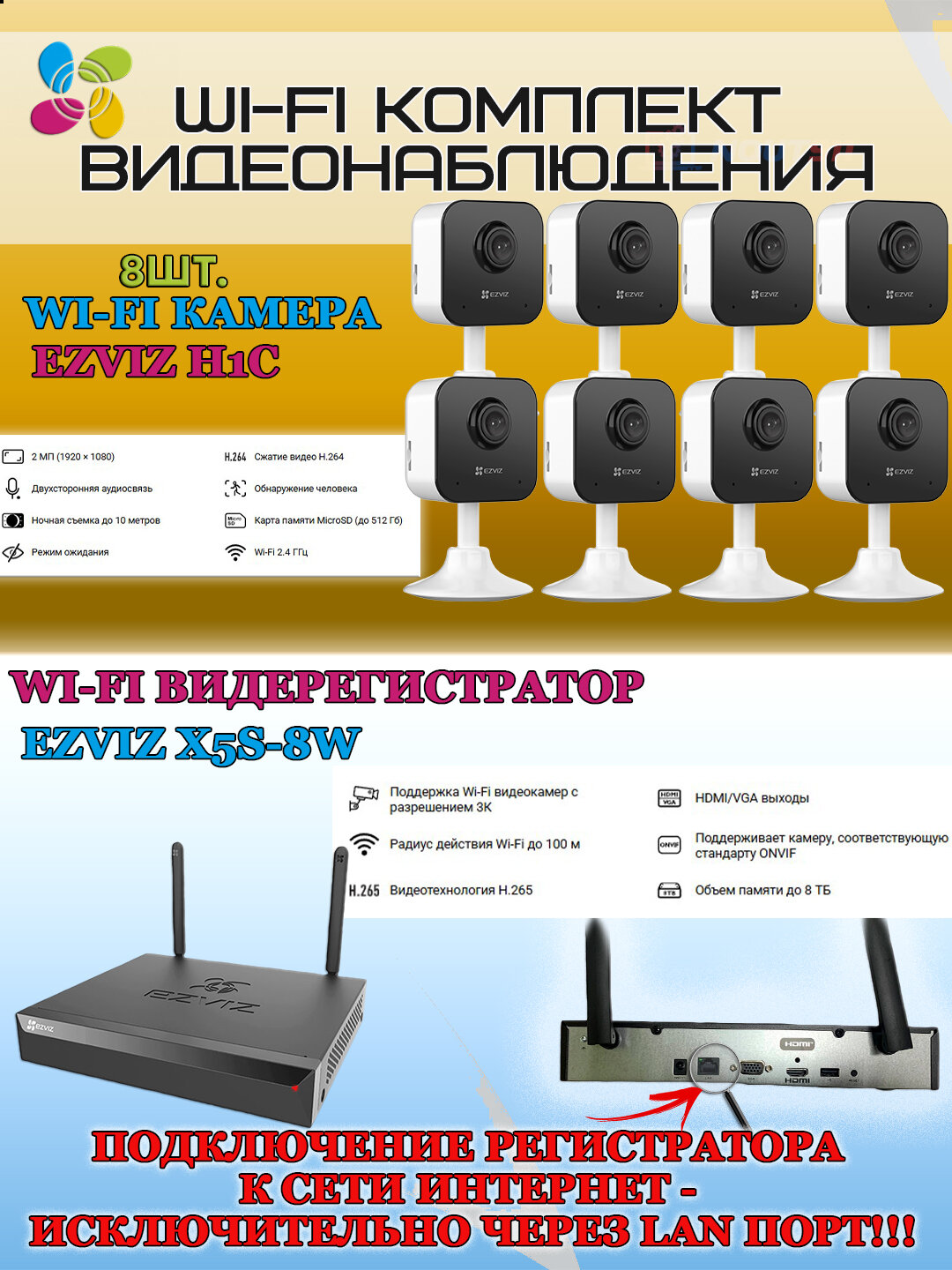 Wi-Fi Комплект видеонаблюдения EZVIZ на 8 видеокамер - 2Мп 1080P (8хCS-H1c + CS-X5S-8W) Двусторонняя аудиосвязь, ИК-подсветка до 10м, угол 108гр, H.265