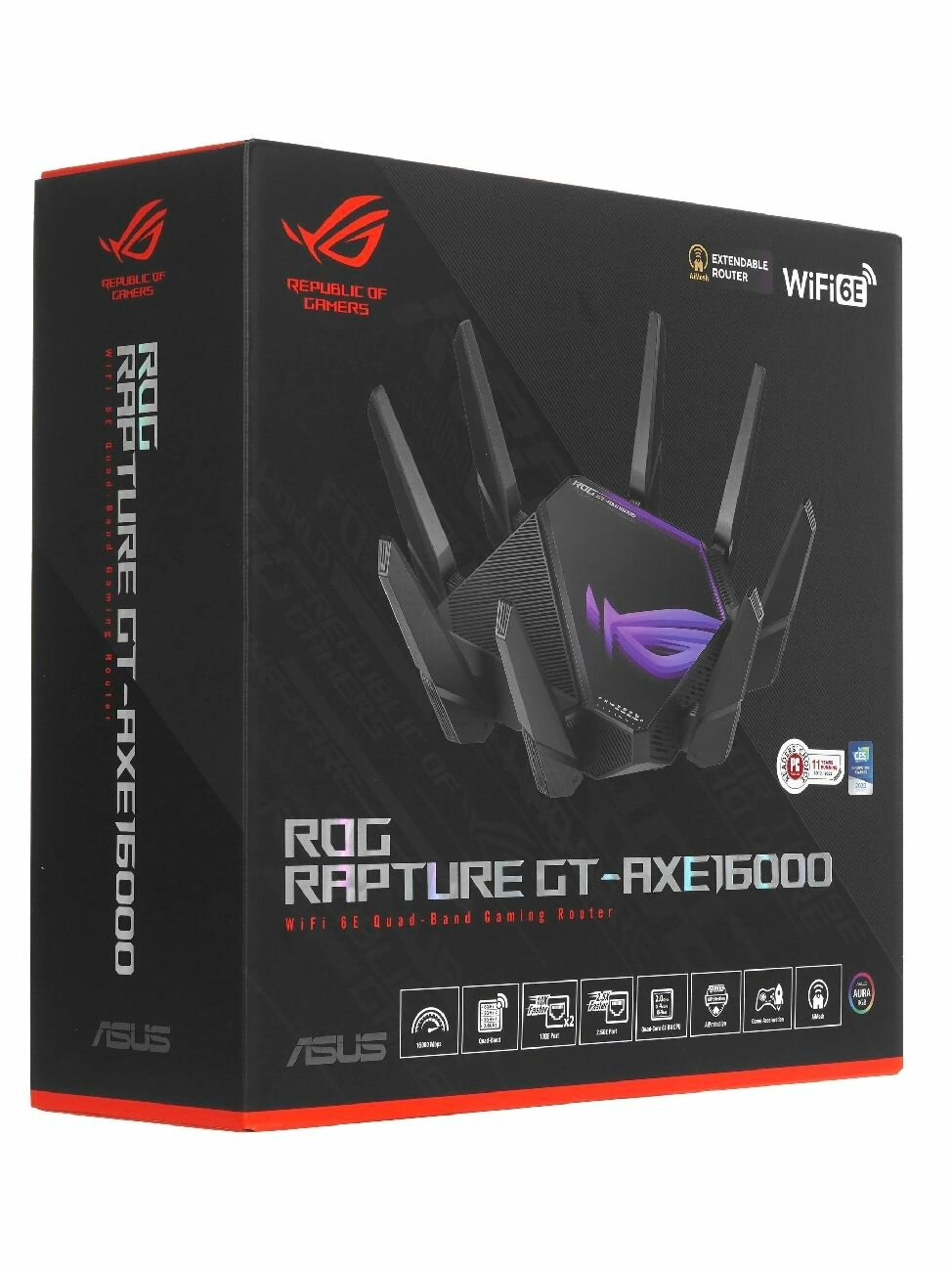 Четырехдиапазонный игровой маршрутизатор ROG Rapture GT-AXE16000 стандарта Wi-Fi 6E: диапазон 6 ГГц, два порта 10G Ethernet, два интернет-порта (один – 2.5G Ethernet), поддержка технологии AiMesh, функция VPN Fusion, трехуровневое геймерское ускорение, бесплатная защитная система. Общая скорость передачи данных до 16000 Мбит/с. В маршрутизаторе ROG Rapture GT-AXE16000 используется четырехъядерный 64-битный процессор, работающий на частоте 2,0 ГГц. Мощности этого чипа хватит для любых нагрузок. На 18% более быстрая обработка сетевых пакетов означает, что в онлайн-играх будет меньше лагов. Основные характеристики: - Тип устройства: Wi-Fi роутер - Стандарт Wi-Fi: Wi-Fi 5 (802.11ac), Wi-Fi 4 (802.11n), Wi-Fi 3 (802.11g), Wi-Fi 6 (802.11ax) - Частотный диапазон: 2.4 ГГц, 5.0 ГГц - Порты Ethernet: 7 - Поддержка AiMesh: да - Скорость Ethernet портов: 2500 Мб/с
