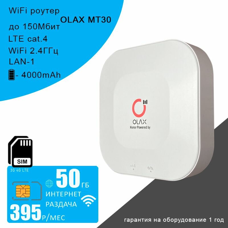 Wi-Fi роутер Olax MT30 + сим карта с интернетом и раздачей, 50ГБ за 395р/мес: сравнение цен, характеристики, фото, актуальное наличие и цены.