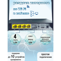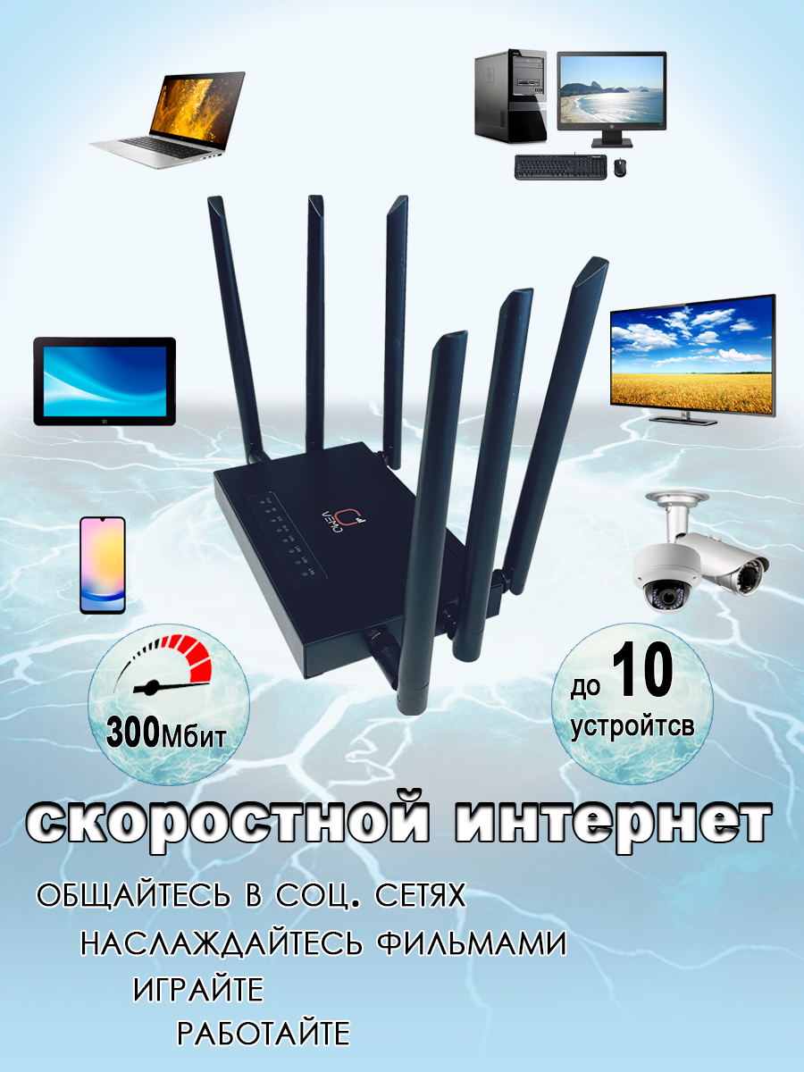 Роутер Vemo B720: профессиональное решение для стабильного интернета Обзор устройства: Роутер Vemo B720 — надежное сетевое оборудование с усиленной конструкцией. Металлический корпус обеспечивает защиту компонентов и эффективное охлаждение. • В комплекте идет сим карта с безлимитным интернетом за 399р/мес в сети мегафон. инструкция по активации прилагается к отправлению. Для активации Вам понядобится активная учетная запись на госуслугах и приложение госключ. Ключевые особенности: • Металлический корпус повышенной прочности • Настенное крепление для удобного размещения • 4 встроенные антенны Wi-Fi • 2 съемные антенны 4G • Разъемы SMA для внешних MIMO антенн • LTE cat.4 со скоростью до 150 Мбит/с • Русскоязычное меню управления • Отсутствие порта WAN для подключения оптической линии • Поддержка до 10 подключенных устройств Преимущества: • Высокая надежность благодаря металлическому корпусу • Мощный сигнал за счет системы антенн • Гибкие возможности подключения • Удобное управление на русском языке • Многопользовательский режим работы Технические характеристики: Устройство оснащено металлическим корпусом и системой антенн для стабильного сигнала. Встроенные Wi-Fi антенны и съемные 4G антенны обеспечивают качественное покрытие. Разъемы SMA позволяют подключать внешние антенны. Роутер поддерживает одновременную работу до 10 устройств, что оптимально для небольших офисов или домашних сетей. Применение Vemo B720 подходит для: • Домашнего использования • Офисных помещений • Удаленных объектов • Торговых площадей • Производственных помещений Простота использования: • Интуитивно понятный интерфейс на русском языке упрощает настройку. Устройство готово к работе сразу после установки SIM-карты. Vemo B720 — надежное решение для организации стабильного интернет-соединения с возможностью подключения нескольких пользователей.