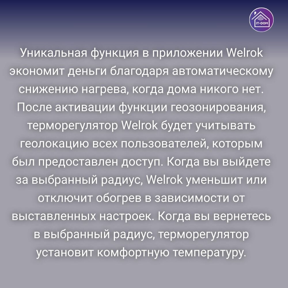 После активации функции геозонирования, терморегулятор Welrok будет учитывать геолокацию всех пользователей, которым был предоставлен доступ. Когда вы выйдете за выбранный радиус, Welrok уменьшит или отключит обогрев в зависимости от выставленных настроек. Когда вы вернетесь в выбранный радиус, терморегулятор установит комфортную температуру.
