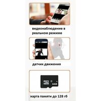 Отличный выбор для дома, квартиры. Подключение к камере с любой точки мира, одновременно сколько угодно людей, у кого будет разрешен доступ. Отличный вариант для слежения за ребенком. Имеется датчик движения, запись на карту памяти со звуком в высоком качестве 4К 1920 x 1080 . Камера поддерживает карты Micro SD объемом до 128 ГБ. Угол обзора камеры 120 градусов, датчик движения 6 метров.