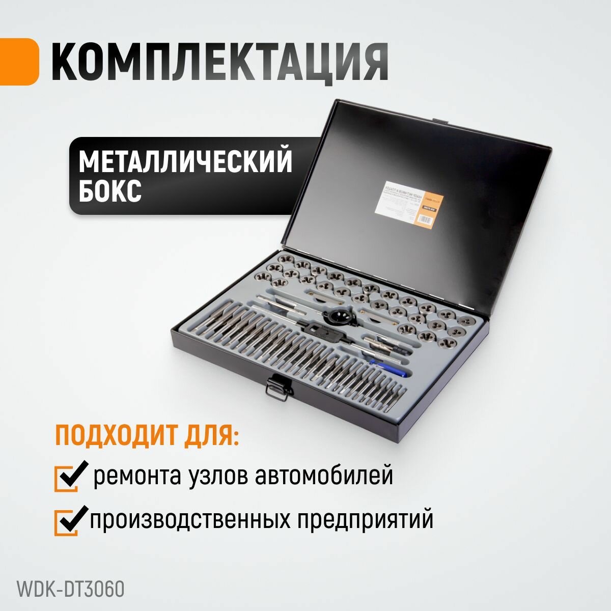 | Подробная комплектация | Комплект метчиков / плашек: М3х0,5, М4х0,7, М5х0,8, М6х1,0, М7х1,0, М8х1,25, М9х1,25, М10х1,5, М10х1,0, М12х1,75 4-40, 6-32, 8-32, 10-24, 10-32, 12-24, 1/4-20, 1/4-28, 5/16-18, 5/16-24, 3/8-16, 3/8-24, 7/16-14, 7/16-20, 1/2-13, 1/2-20, 1/8NPT27 Метчикодержатель: М4 - М12 Т-образный цанговый: М3 - М6 Плашкодержатель: 25х9 Набор щупов: для измерения шага метрической резьбы для измерения шага дюймовой резьбы Отвертка: шлицевая 3,5х0,6 |