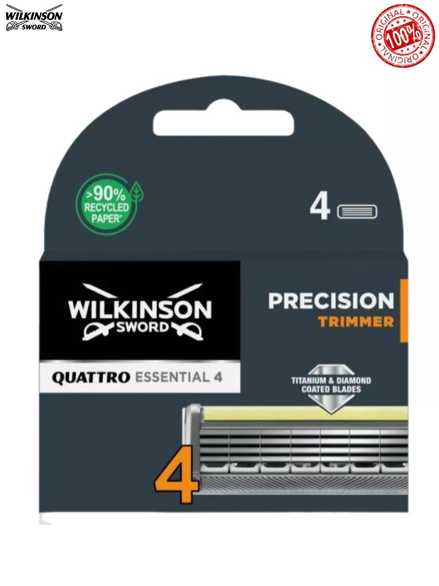 Wilkinson Sword Сменные кассеты QUATTRO Titanium Essential Precision (4 шт.), 4 лезвия + лезвие-триммер, увлажняющая полоска. С четырьмя лезвиями и точным лезвием-триммером с обратной стороны. Кассеты снабжены защитными проволочными решетками для предотвращения порезов. Для чувствительной кожи. На каждый картридж нанесена гелевая полоска из экстрактов алоэ и жожоба, предназначенная для увлажнения и подготовки кожи к бритью. Лезвия удобны в использовании, с легкостью удаляют волосы, длительное время сохраняются острыми, и не доставляют дискомфорта во время бритья. Кожа после удаления волос остается гладкой и шелковистой. Данные сменные кассеты совместимы со всеми бритвенными системами с креплением типа Quattro: Quattro, Quattro Titanium, Quattro Titanium Sensitive, Quattro Titanium Precision.