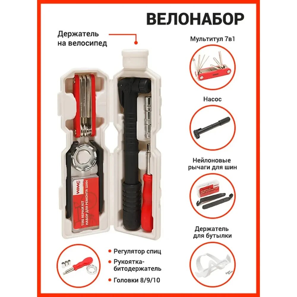 WMC TOOLS Набор инструментов для обслуживания велосипеда 27 предметов +держатель фляги в тубе WMC-2727W(49889): сравнение цен, характеристики, фото, актуальное наличие и цены.