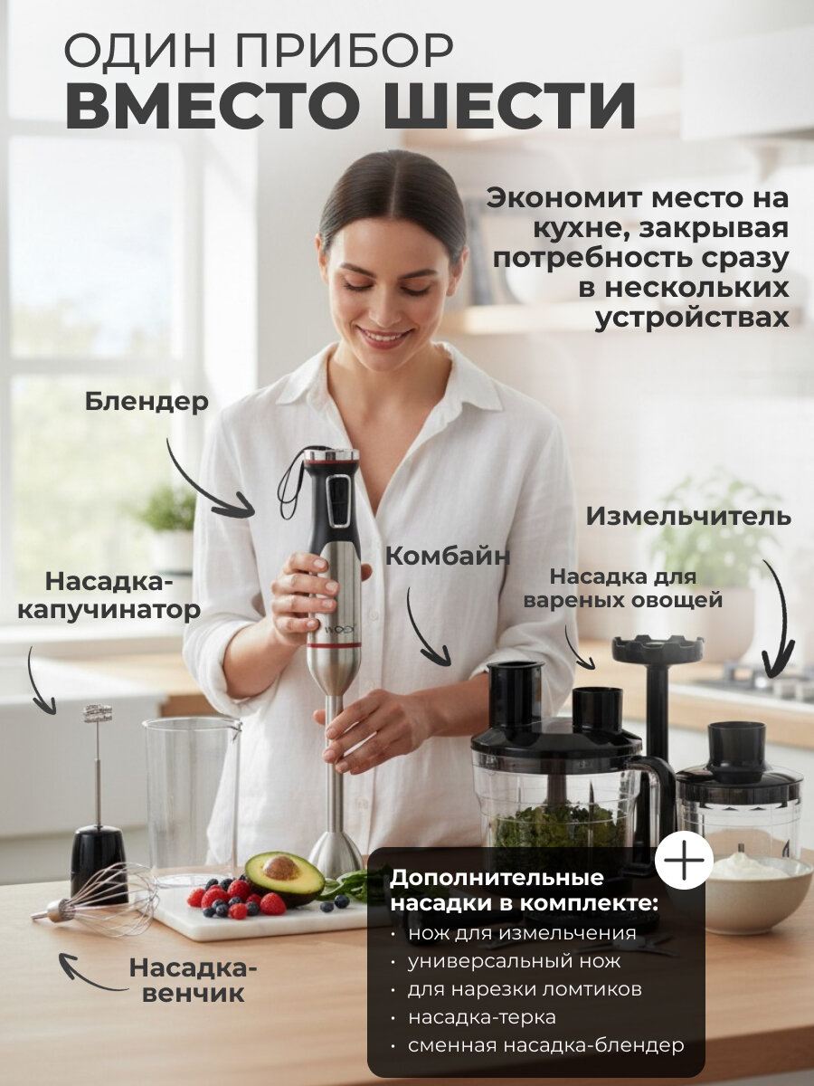 Представляем вам многофункциональный погружной блендер WOEX Power Kit 1710 — это не просто прибор, а настоящая кухонная машина. Он кардинально упростит приготовление любимых блюд, сэкономив ваше время и силы.