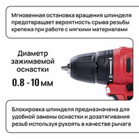 Диаметр зажимаемой оснастки от 0,08 до 10 мм позволяет использовать широкий спектр насадок, а блокировка шпинделя облегчает замену оснастки и затягивание резьбы. Цветовая индикация остаточного заряда аккумуляторной батареи позволяет контролировать уровень заряда, а светодиодная подсветка обеспечивает хорошую видимость в тёмных местах.