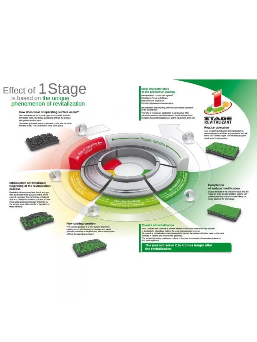 Присадка для дизельных и бензиновых двигателей XADO Revitalizant 1 Stage. Предназначен для восстановительного ремонта и гарантированной защиты от износа бензиновых, газовых (LPG) и дизельных двигателей без их разборки. Ревитализант XADO 1 Stage для двигателя инновационный продукт третьего поколения ревитализантов XADO, открывающий новые возможности защиты и восстановления узлов двигателя. Многолетние исследования в области трибологии и применения ревитализантов XADO позволили создать новый продукт с оптимальной размерностью и концентрацией активированных наночастиц ревитализанта. Восстанавливает поверхности трения, защищает и упрочняет детали двигателя Увеличивает и выравнивает компрессию в цилиндрах Повышает мощность и приемистость двигателя Снижает расход топлива Повышает давление в маслосистеме двигателя до номинального Увеличивает срок службы узлов в 2-3 раза Защищает от негативных последствий холодного пуска Снижает уровень шумов и вибрации Благодаря новой технологии активирования наночастиц, ревитализант 1 Stage, является катализатором высокоскоростной модификации и саморегулированного роста изношенной поверхности. XADO 1 Stage Ревитализант для двигателя позволяет производить обработку двигателя в один этап; универсален для бензиновых, газовых (LPG) и дизельных двигателей. Обладает пролонгированными защитными свойствами и способностью к саморегенерации длительный период. Применение Способ применения ревитализанта не отличается сложностью. Просто внесите средство в маслозаливное отверстие двигателя, предварительно прогрев агрегат до рабочей температуры. Далее запустите мотор и обеспечьте его функционирование на холостом ходу в течение 3-5 минут. Считать обработку законченной можно спустя 1500 км пробега. До окончания обработки не рекомендуется производить замену масла. Ревитализант хадо совмещается с любым типом моторного масла, не изменяя их эксплуатационных характеристик.