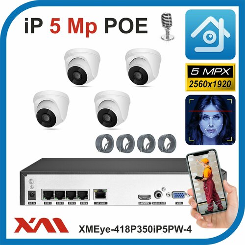 Xmeye-418P350iP5PW-4-POE. Комплект видеонаблюдения POE на 4 камеры с микрофонами, 5 Мегапикселей.