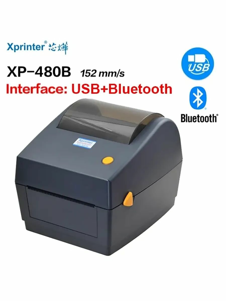 Почему нужно купить принтер у нас? +Предлагаем только оригинальную продукцию +Гарантия от магазина 12 месяцев +Помощь в настройке для покупателей нашего магазина Почему ваши цены выше конкурентов? +Мы предлагаем своим клиентам бесплатную поддержку и удалённую настройку принтера и программ в течении всего гарантийного срока +Если вы цените сервис и гарантию качества продукта, то вы сделаете правильный выбор. Модель с увеличенным отсеком для рулона Xprinter XP-480B USB+Bluetooth в чёрном корпусе. Позволяет установить внутрь принтера рулон большей намотки чем в модели XP-420B или XP-460B. Благодаря дополнительному интерфейсу Bluetooth, есть возможность печати шаблонов со смартфона. внимание: Подключение в MacOS по Bluetooth не работает, в данной системе необходимо использовать USB или WiFi подключение. Подходит для этикеток: 30*20 40*30 43*25 58*30 58*40 - Используется Озон и ВБ 58*60 75*120 - Используется Озон 100*150 - Используется в разных службах доставки И любые другие размеры шириной до 110мм. ● Подходит для Маркировки Честный знак, печать 1D/2D штрих-кодов ● Подходит для Ozon, ВБ и т. д. ● Высокая скорость печати 152 мм/с ● Возможность использовать Внешний лоток для рулона ● 8 МБ SDRAM , 8 МБ Flash ● Высокое качество конструкции с легкой установкой рулона ● Интеллектуальная система контроля температуры печатающей головки обеспечивает стабильную работу принтера