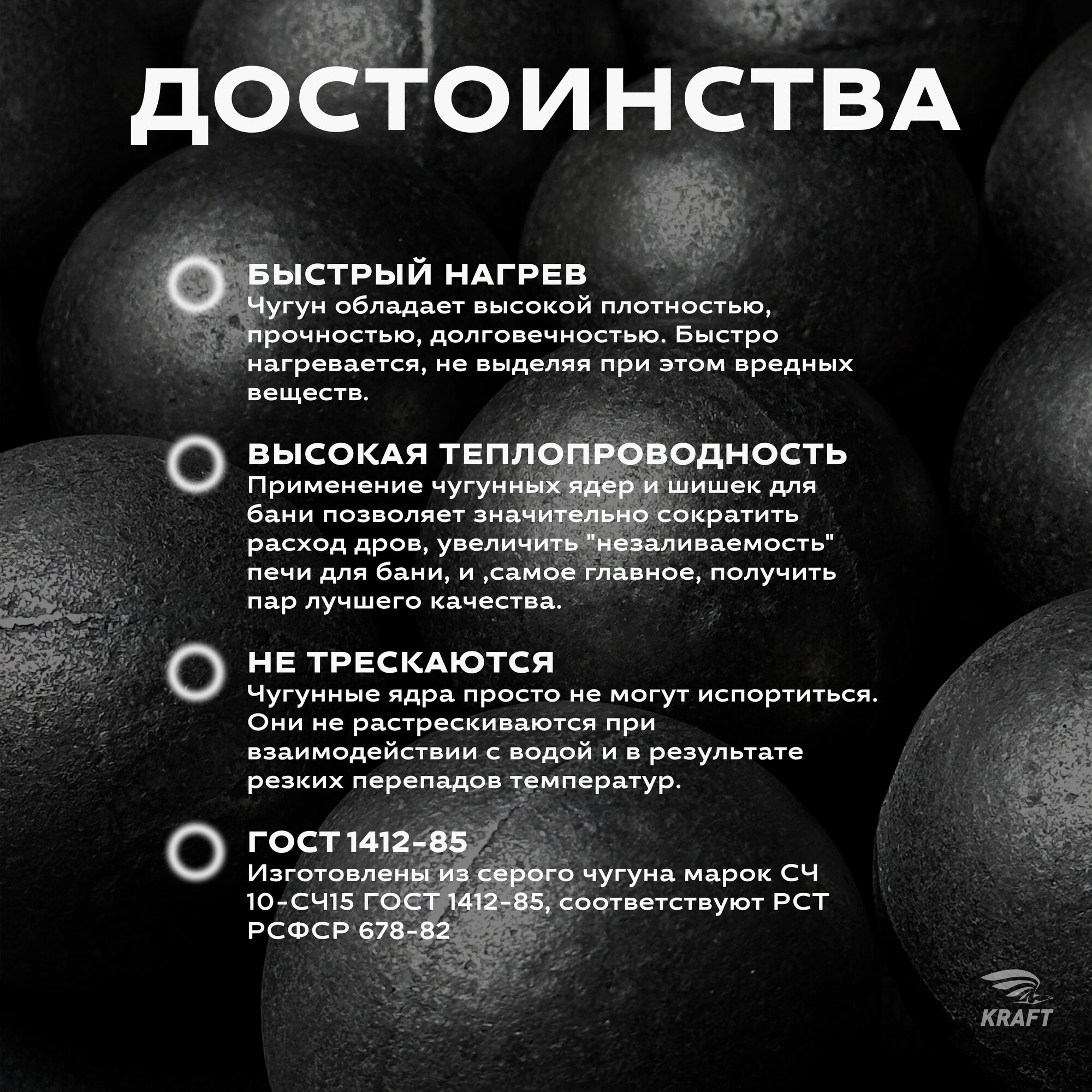 Чугунные ядра для банных печей служат для искусственного увеличения массы банной печи и тем самым увеличивают её теплоёмкость. Чугунные ядра укладываются на поверхность каменки под декоративный слой камней. Необходимость в самих камнях практически исчезает так как парообразование теперь идёт с поверхности самих чугунных шаров. Для значительного увеличения теплоёмкости любой банной печи применяются чугунные заклады, которые накапливают тепла больше чем сама печь и берут на себя роль поверхности с которой образуется пар. При высоком нагревании чугунных ядер пар получается мелкодисперсным, гораздо боле качественным, чем пар с поверхности меньшей температуры. Применение чугунных ядер и шишек для бани позволяет значительно сократить расход дров, увеличить "незаливаемость" печи для бани, и , самое главное, получить пар лучшего качества. Нагреваются такие ядра очень быстро. По сравнению с натуральными минералами для бань их теплопроводность в несколько раз выше. Чугун можно использовать вместе с камнями. Такая комбинация позволит добиться комфортной атмосферы. Чугун обладает высокой плотностью, прочностью, долговечностью. Быстро нагревается, не выделяя при этом вредных веществ. Чугунные ядра просто не могут испортиться. Они не растрескиваются при взаимодействии с водой и в результате резких перепадов температур. Такой материал хорошо подойдёт для бани.