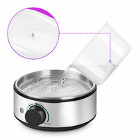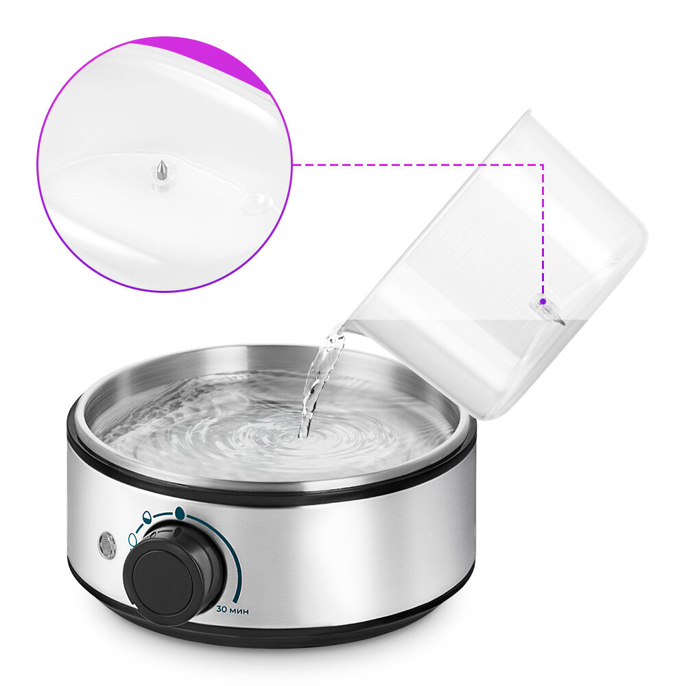 Практичней кастрюли Яйцеварка КТ-9802 предназначена для варки яиц на пару. Варёные яйца — неотъемлемый элемент вкусного, полезного, простого завтрака. Иногда не получается аккуратно положить яйца в кастрюлю с водой или вода слишком горячая, и яйца бьются друг о друга. Понятное управление У основания устройства находится регулятор со встроенными программами работы. Всего программ работы 3: Всмятку, в мешочек и вкрутую. У всех программ разное время готовки и количество затрачиваемой воды, будьте внимательны. Хватит на всех! В корпусе яйцеварки находится резервуар для воды ёмкостью 200 мл. Мерный стакан поможет налить вам точное количество воды в резервуар. В дно стаканчика встроена игла, с помощью которой можно проколоть скорлупу, будьте осторожны! Форма для яиц Помимо приготовления яиц непосредственно в скорлупе вы так же можете использовать форму для яиц. Установите основание на яйцеварку, а на основание установите форму для яиц, добавьте в неё яйца. Преимущества готовки Использование яйцеварки имеет много преимуществ по сравнению с варкой яиц в кастрюле, например яйца не соприкасаются друг с другом, вследствие чего не трескаются и не растекаются. В них не впитывается вода через скорлупу и вкус получается более нежный.
