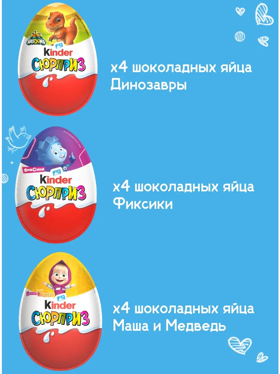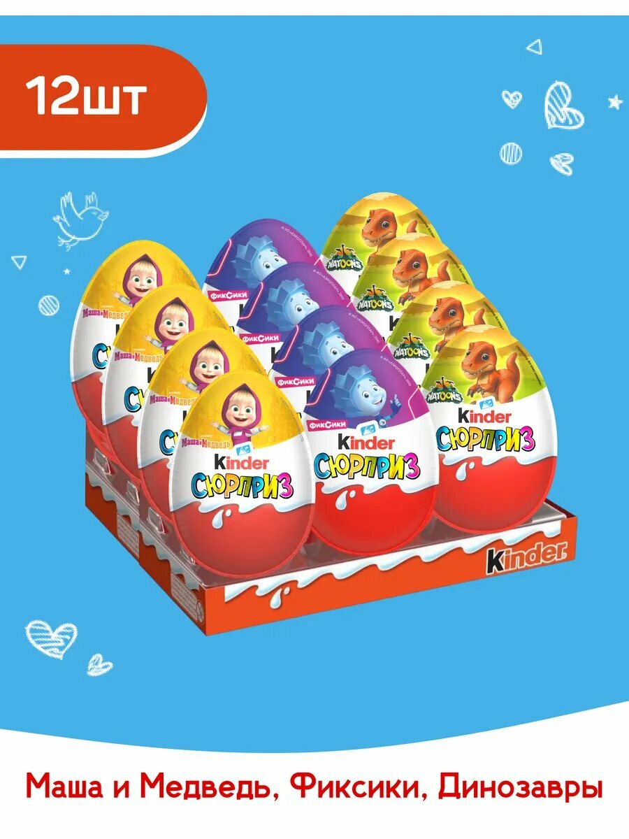 Купить Яйцо Kinder Сюрприз из молочного шоколада, с игрушкой внутри: Динозавры, Маша и Медведь, Фиксики, 12 шт по 20 г с доставкой по всей России.