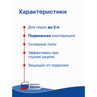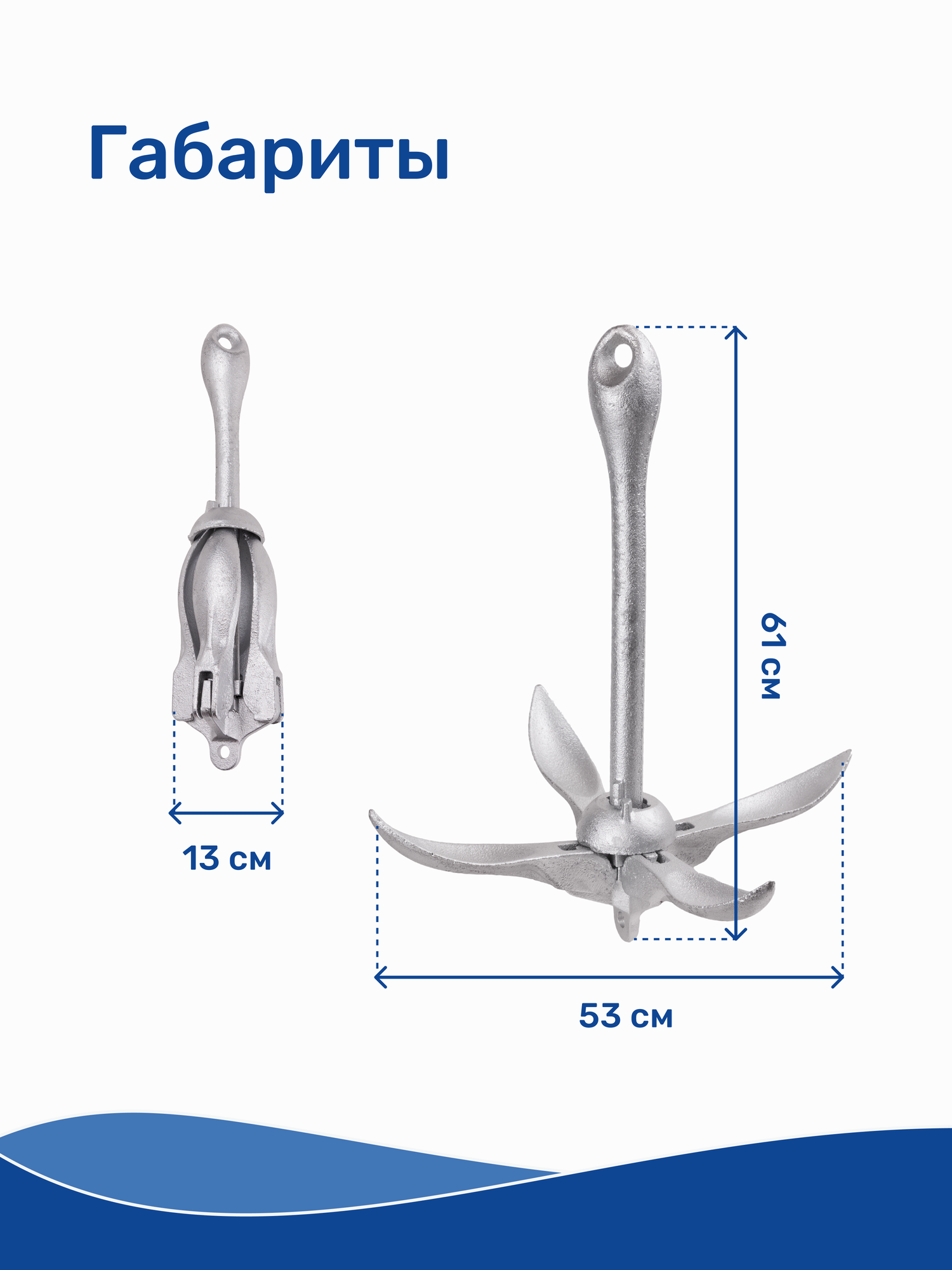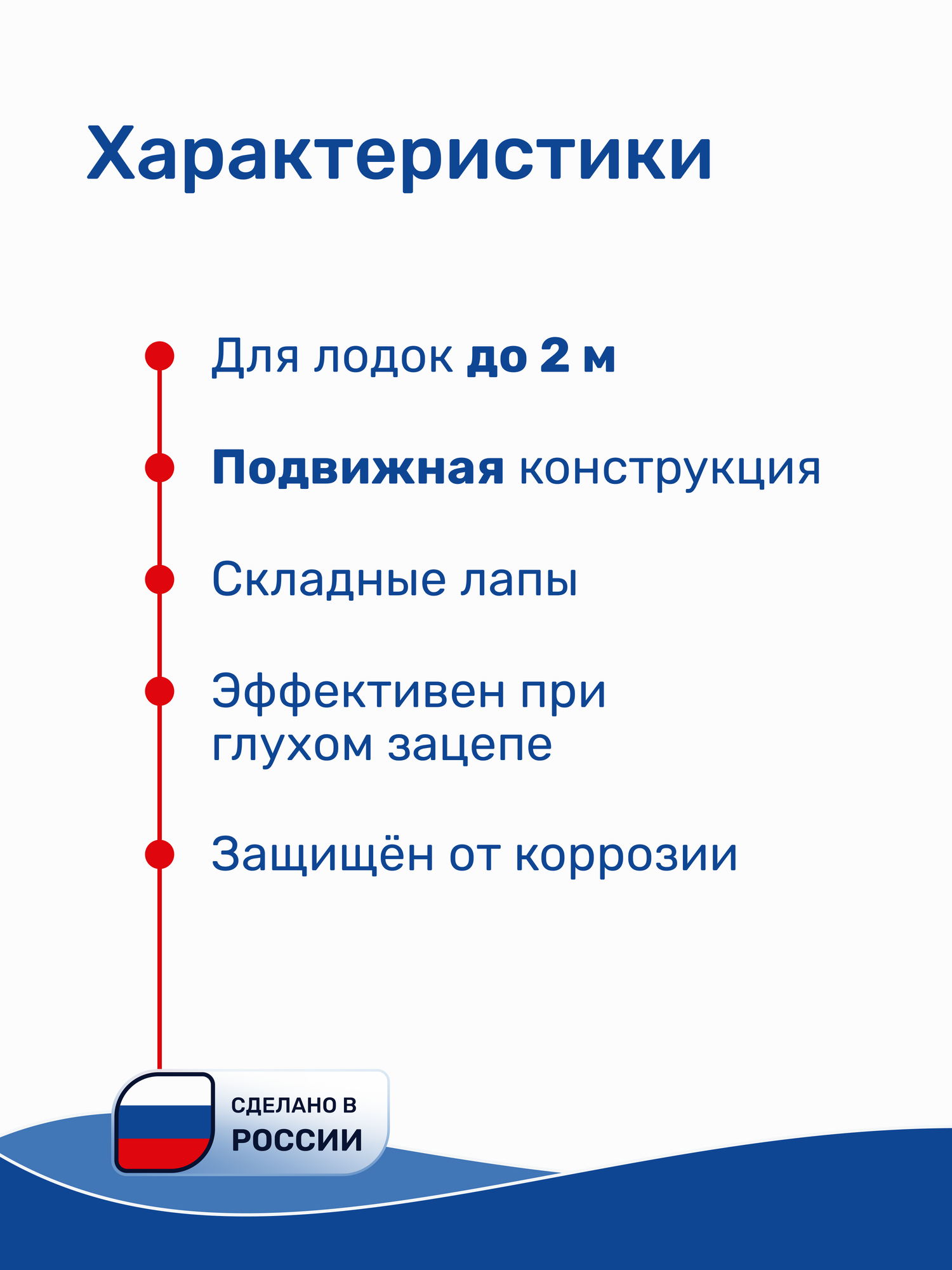 Лодочный якорь – это универсальное устройство, предназначенное для удержания плавсредства на одном месте за счет сцепления с грунтом. Такие износостойкие речные и морские аксессуары отлично подходят для маломерных небольших судов, для пвх лодочки. Если у вас надувная лодка, то вам также будет удобно использовать эргономичный складной якорь. Якорь - кошка прекрасно "работает" с песчаным дном и закоряженными участками. Однако, если дно илистое или каменистое, то, в данном случае, это средство не подойдет. "Кошку" можно купить для лодки до 3,5 м. Такой якорь можно использовать при поисках и подъеме различных затонувших вещей. Методом траления можно поднять со дна какую-то цепь, трос и другие подобные предметы. Оцинкованный якорь можно забрасывать на сильно захламлённое дно без риска, что устройство застрянет намертво. Якорь - кошка эффективен при глухом зацепе, защищен от коррозии, компактен в сложенном виде. Особенность - рым в комплект не входит. Для этого якоря рекомендована якорная намотка. Цвет изделия - серебристый. Длина - 61 см, Ширина в сложенном виде - 13 см, Ширина в разложенном виде - 53 см