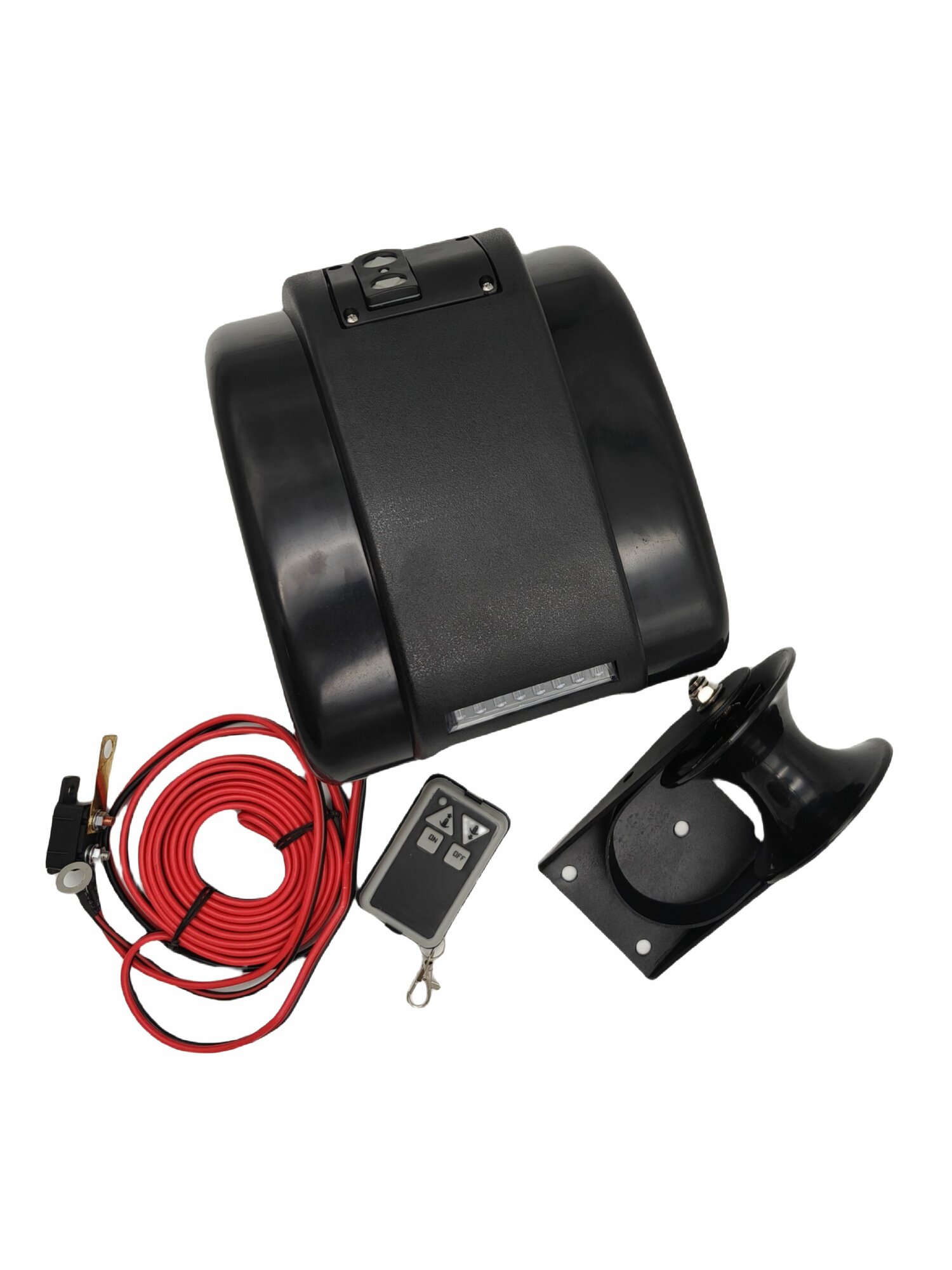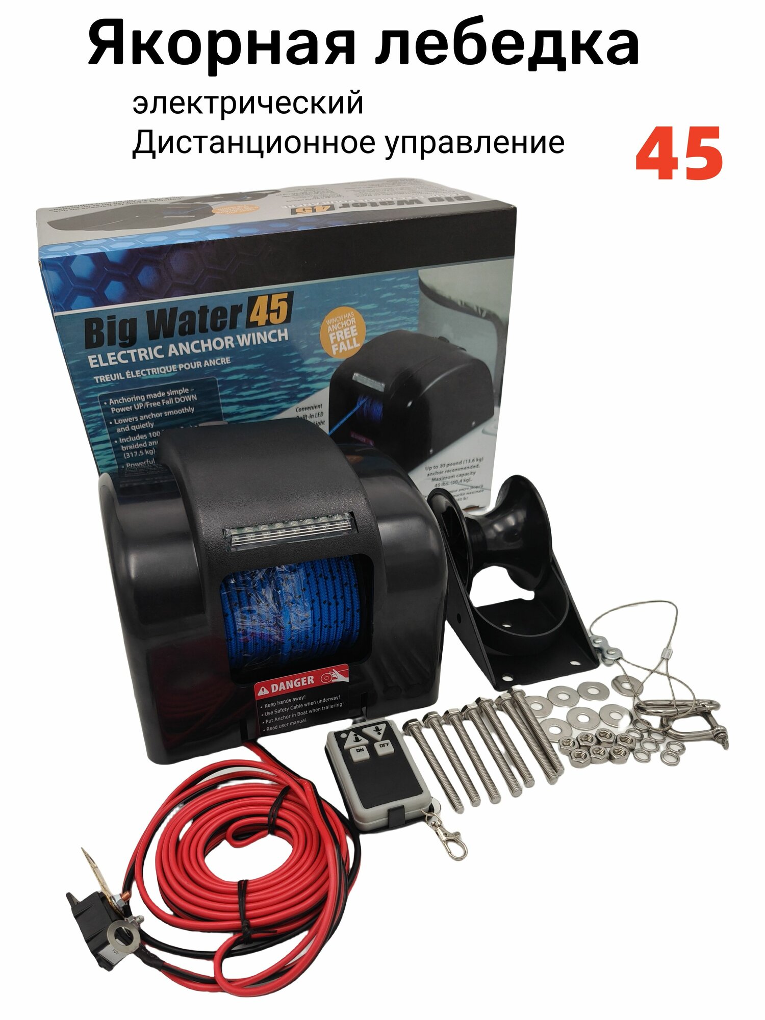 Комплект поставки: электрическая якорная лебедка, ролик, дистанционное управление, крепеж, инструкция