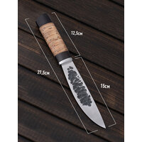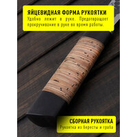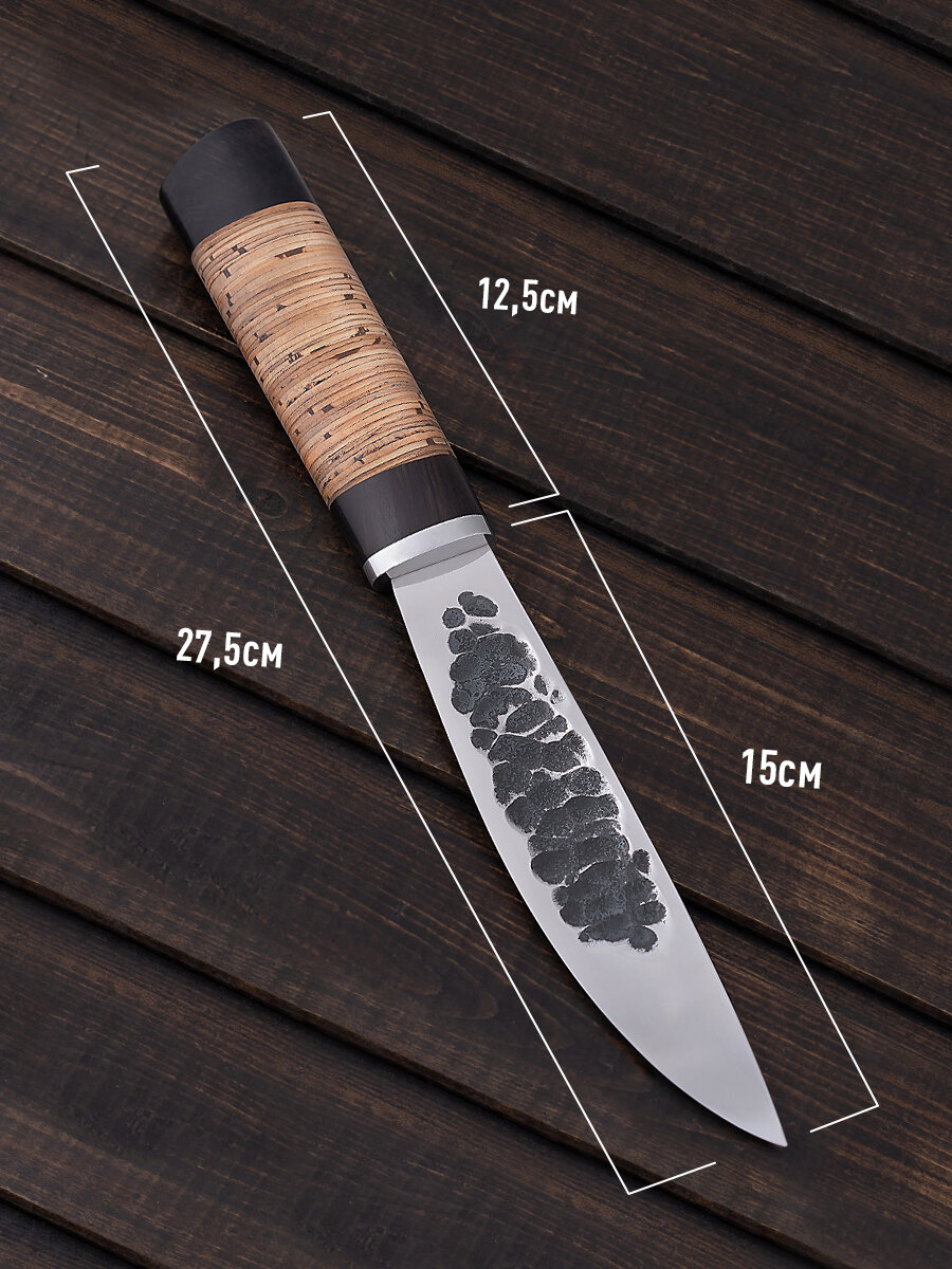 Рукоятка сделана из венге и бересты, не рассыхается, не боится влаги, греет руку во время работы. В комплекте идут кожаные ножны. Ножны фиксируются на свободном подвесе на ремень.