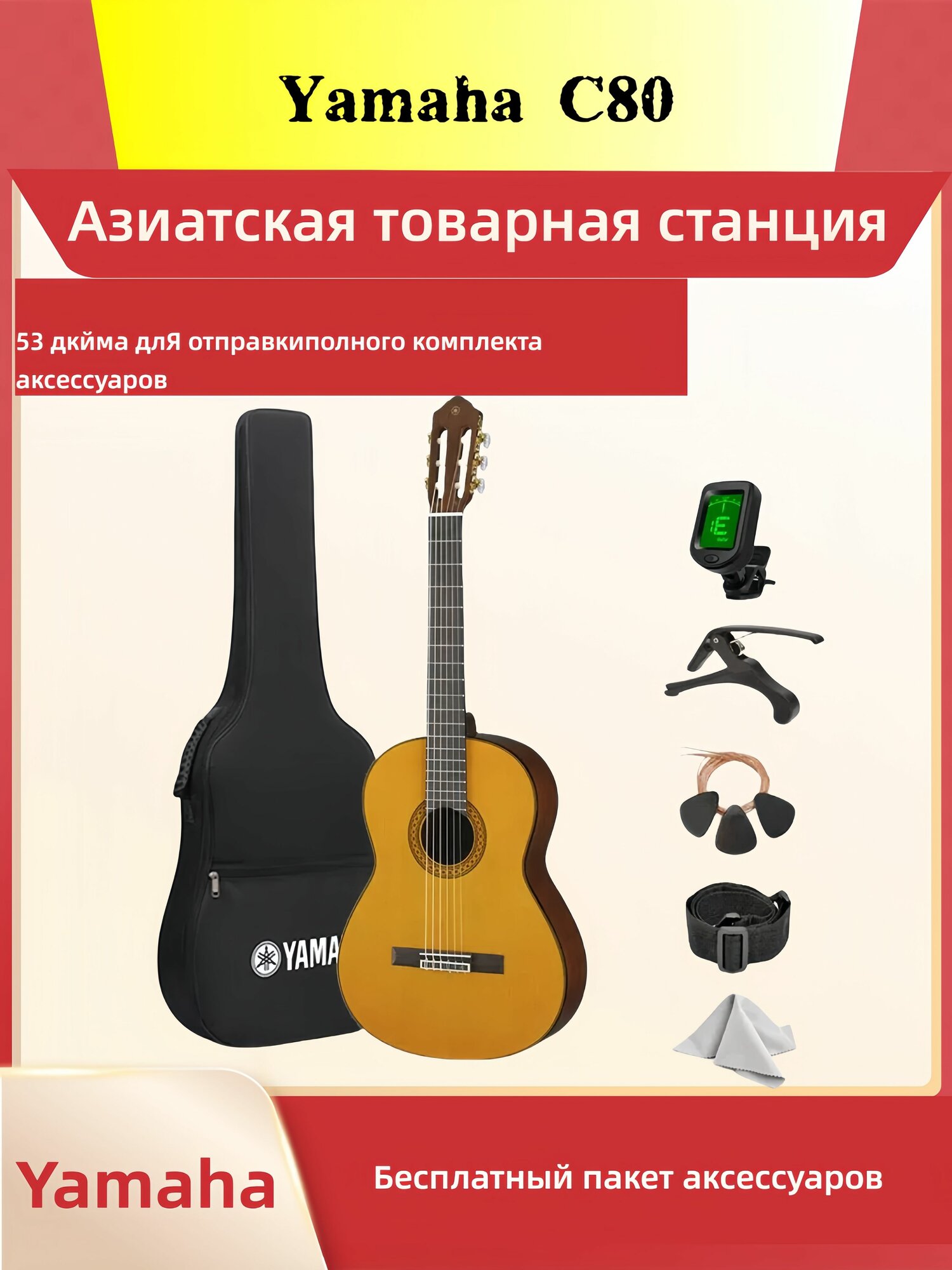| В комплекте | Классическая гитара, запасной комплект гитарных струн, рюкзак, каподастр, медиаторы (случайные цвета), тюнер, ткань для протирки (случайные цвета). |