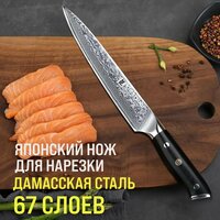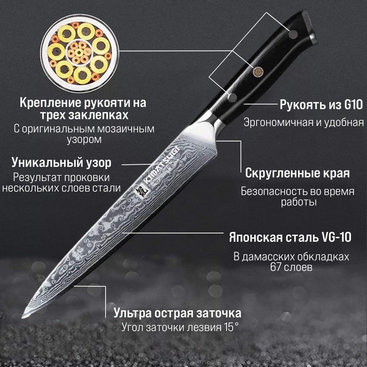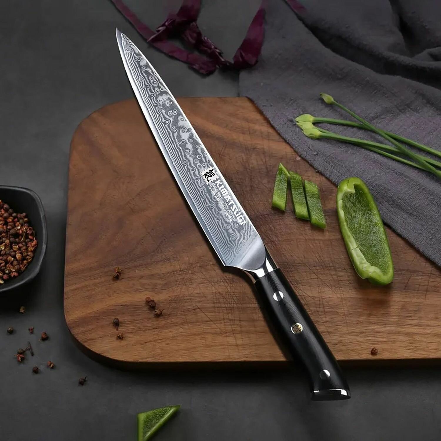 Кухонный нож для нарезки от японского производителя Kimatsugi (серия Damascus) подходит для разделки птицы, кролика, рыбных туш, нарезки стейков и рубленого фарша, шинковки капусты, овощей, фруктов, слайсирования гастрономии и прочих задач повара. Шеф-нож предназначен и для профессионального, и для домашнего применения.