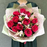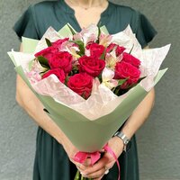 Яркий букет из 11 малиновых роз с розовой альстромерией в стильной зеленой упаковке с добавлением тишью (1): сравнение цен, характеристики, фото, актуальное наличие и цены.
