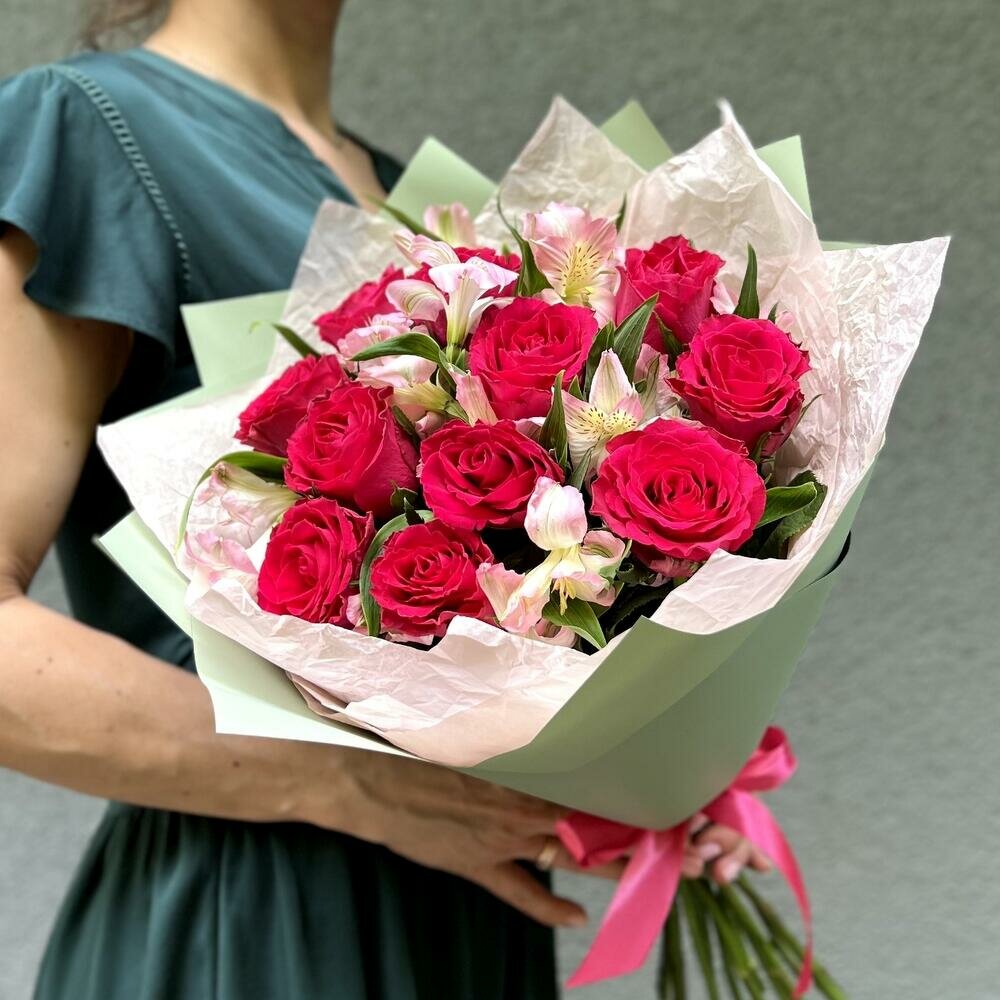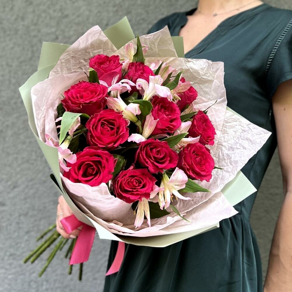 Купить Яркий букет из 11 малиновых роз с розовой альстромерией в стильной зеленой упаковке с добавлением тишью (1) с доставкой по всей России.