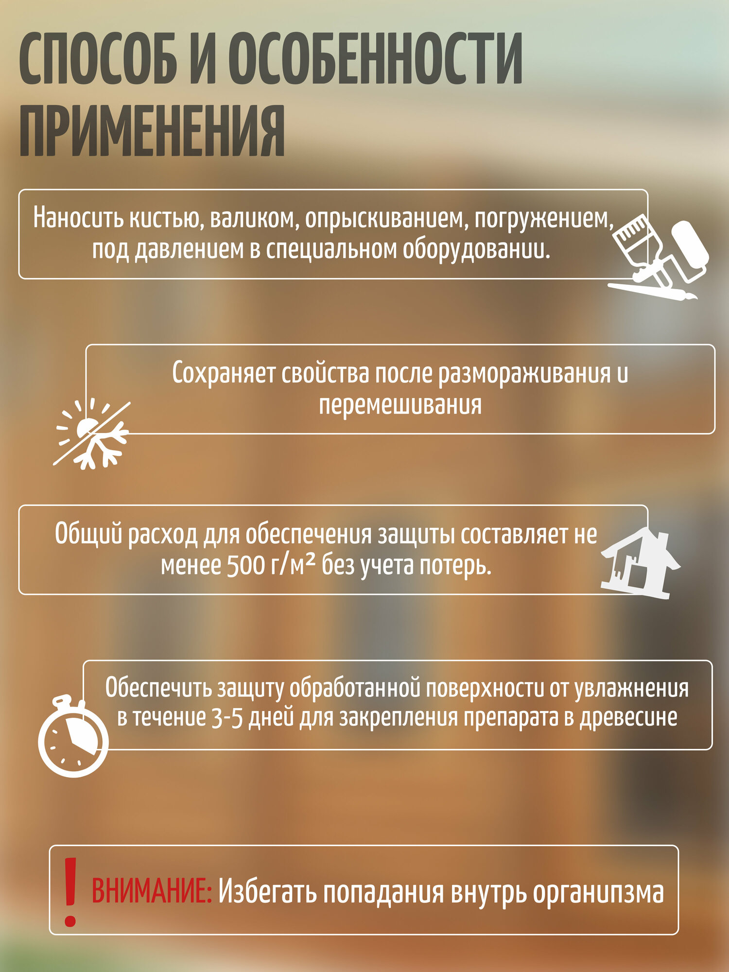 Нанесение антисептика может осуществляться различными способами: кистью, валиком, опрыскиванием, погружением или под давлением в специальном оборудовании. Для обеспечения максимальной и продолжительной защиты, общий расход антисептика составляет не менее 500 г/м2 без учета потерь.