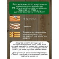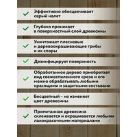 Эффективно обесцвечивает серый налет Глубоко проникает в поверхностный слой древесины и уничтожает плесневые и деревоокрашивающие грибы и их споры, дезинфицируя поверхность Обработанное дерево приобретает вид свежеспиленного среза и его можно обрабатывать любыми красящими и защитными составами Сохраняет физико-химические свойства и не препятствует естественному «дыханию» древесины