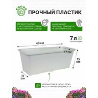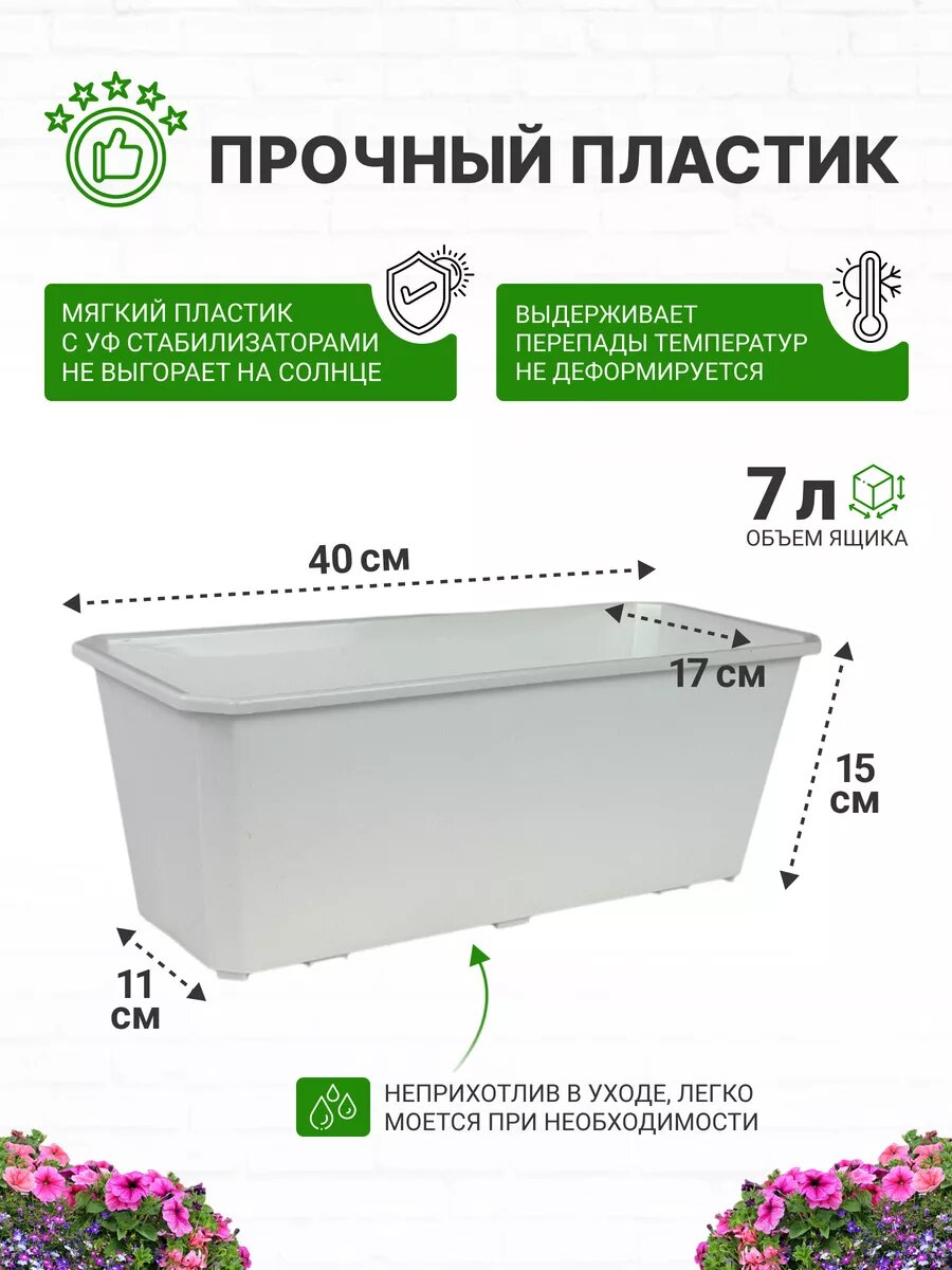 Балконный ящик выполнен в классической прямоугольной форме. Отлично подойдет для украшения вашего балкона однолетними растениями, универсальная цветовая гамма подойдет к любому стилю оформления балкона. Пластик легкий и прочный, не повреждается и не выгорает на солнце, выдерживает низкие температуры (до -5С). Гладкие стенки ящика препятствуют врастанию корней растений, обеспечивая комфортную пересадку. Неприхотлив в уходе, легко моется при необходимости. Корзина-крепление для балконных ящиков длиной до 40 см. Подходит для всех балконных ящиков длиной не более 40 см. Высота при этом не имеет значения. Корзина-Крепление помогает надежно установить балконный ящик на перила балкона. Размеры: длина 40 см, ширина дна 16 см, высота общая 25 см (от крючка до корзины). Допустимая ширина перил: 7 см. Диаметр прутка 4 мм.