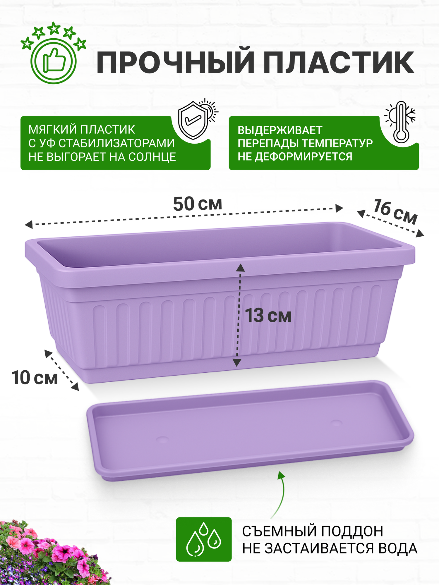 Балконный ящик с поддоном 50 см сиреневый - это стильное и функциональное решение для создания уютного уголка на балконе, террасе или дома.