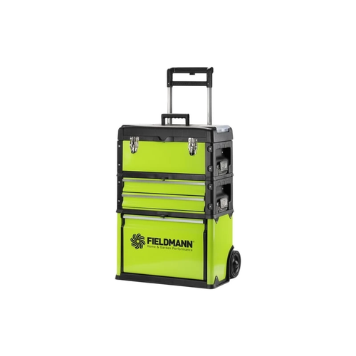 Прочная телескопическая ручка будет полезна при транспортировке, но не будет мешать при работе с отдельными частями. Колеса из прочного пластика гарантируют долгий срок службы всего ящика.
