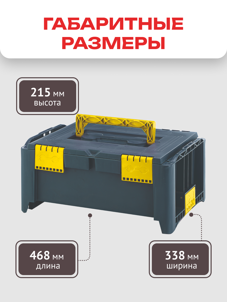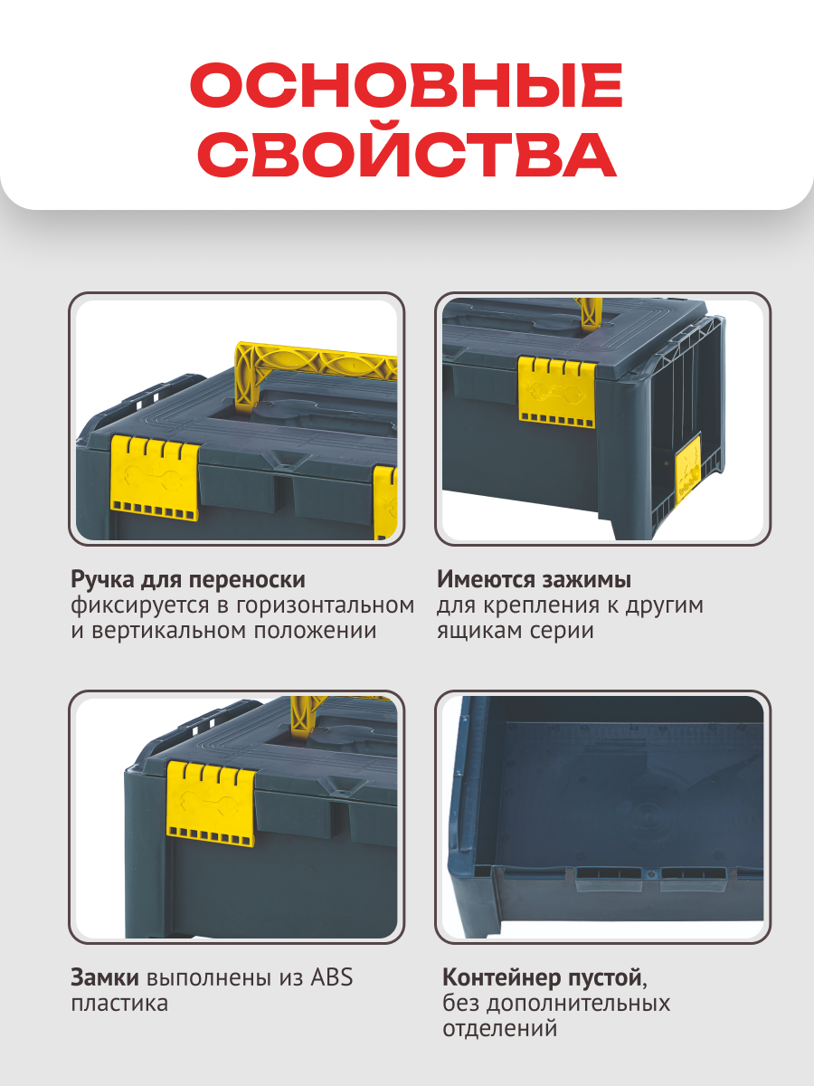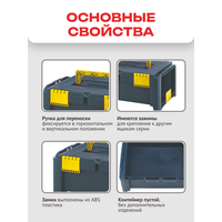 Ящик оснащен удобной ручкой для переноски, а также пластиковыми передним и боковыми замками. Это обеспечивает безопасность хранения инструментов и предотвращает их случайное выпадение.