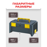 Ящик имеет размеры 468х338х215 мм и объем 31 литр, что позволяет разместить в нем большое количество инструментов. Максимальная нагрузка на ящик составляет 34 кг, что делает его подходящим для хранения как легких, так и тяжелых инструментов.