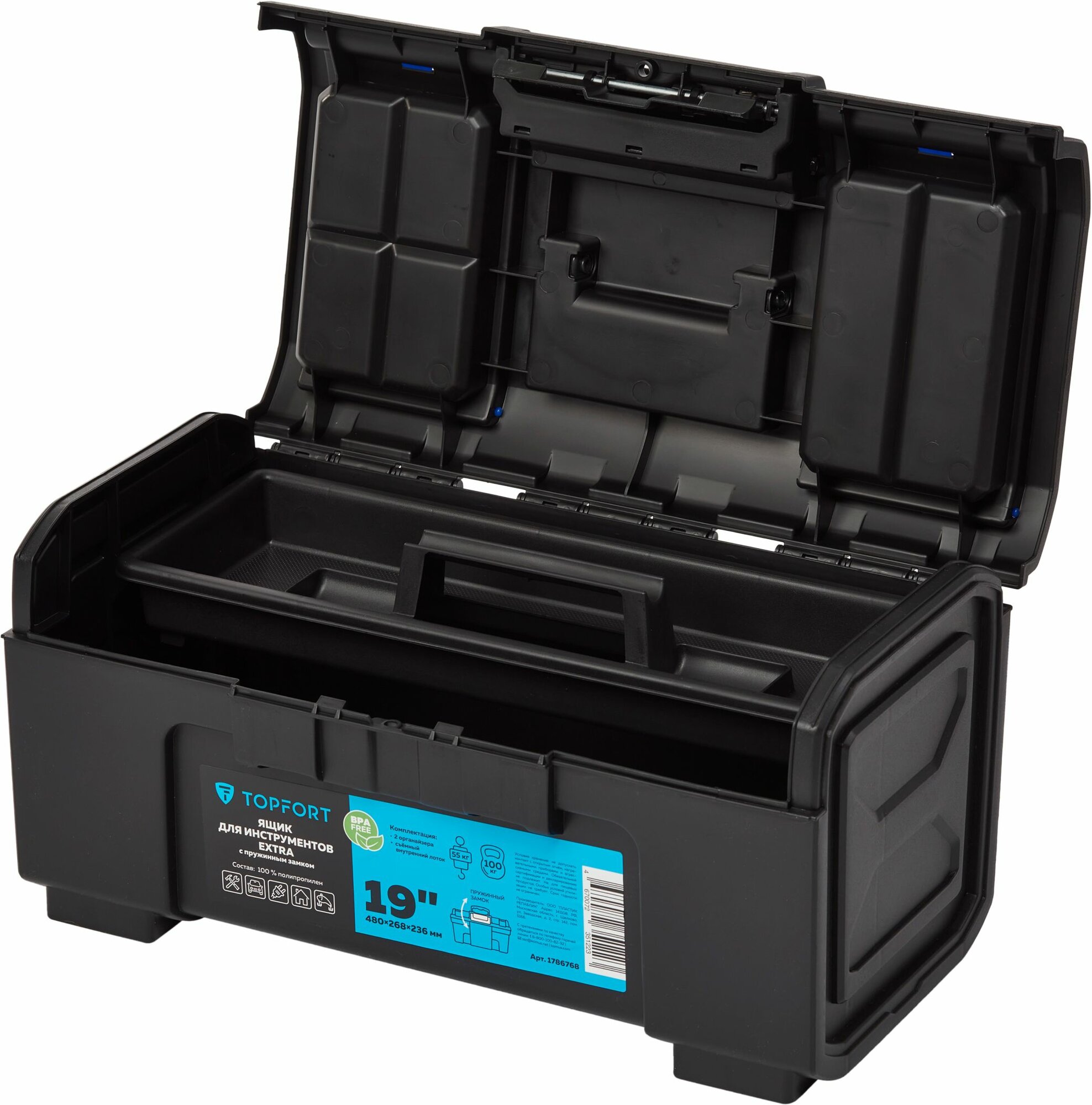 Надежный и вместительный ящик для инструментов — идеальный помощник в организации рабочего пространства. Изготовленный из высокопрочного пластика, он выдерживает нагрузку до 100 кг. Сверхпрочная конструкция, допускает использование в качестве стула или возвышенности при выполнении высотных работ. Удобные размеры 480x268x236 мм позволяют хранить инструменты разных габаритов. Инструментальный бокс отлично подходит для профессионального и бытового использования. Это удобное решение для электриков, сантехников, плотников, автомехаников и монтажников. Также модель будет полезна для дачи, гаража, домашнего ремонта и хранения оборудования в автомобиле. Крышка ящика оснащена органайзерами для хранения мелочей. Пружинный замок, приводимый в действие одной рукой, экономит время при многократных открытиях/закрытиях ящика. Наличие ручки позволяет переносить инструменты на место выполнения работ. Съемный внутренний лоток позволяет отделить инструменты и аксессуары первой необходимости от основного отсека. Возможность использования навесного замка защитит содержимое от свободного доступа, в том числе обеспечит безопасность детей. Topfort Extra 19 — это не просто контейнер, а профессиональная система хранения. Он поможет вам всегда держать под рукой все необходимое, экономить место и быстро реагировать на задачи. Прекрасный подарок для мужа, коллеги, друга или мастера на все руки. Выберите Topfort и доверьте хранение своего инструмента проверенному решению!