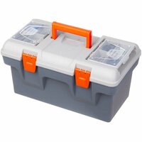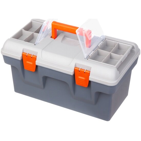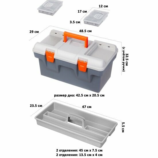 Ящик для инструментов "Массимо" 48,5х29х25,5 см 19 л, с крышкой с 2-мя защелками и 2-мя съемными органайзерами с крышками размером 17х12х3,5 см с 4-мя отделениями 7,5х5х3 см - каждое, с вкладышем с 4-мя отделениями 47х23,5х5,5 см (2 отделения 45х7,5 см, 2 отделения 13,5х4 см), высота ящика с ручкой 32,5 см, размер дна 42,5х20,5 см, серый