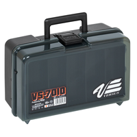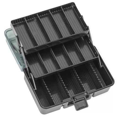 Meiho VS-7010 - уникальная модель ящика с двумя выдвижными полками, сочетающая в себе оригинальное решение компактности и функциональности в виде чемоданчика и классического ящика с выдвижными полками. Надежная система реек, выполняющая поддержку полок, обеспечивает прочность конструкции с плотным прилеганием полок друг к другу, сохраняя исходное положение приманок и аксессуаров даже при вертикальной носке. Ящик плотно закрывается надежным замком-защелкой. Удобная рифленая углубляющаяся в корпус рукоять выполнена из плотного и упругого пластика обеспечивает комфортный хват даже если ладони влажные. • 2 выдвижных лотка глубиной 22 мм оснащены 4 съемными перегородками для разграничения и конфигурации пространства; • Основное нижнее отделение глубиной 55 мм оснащено 4 съемными перегородками-подставками со специальными отверстиями для фиксации приманок крючками (пилькеры, воблеры и т. д.).