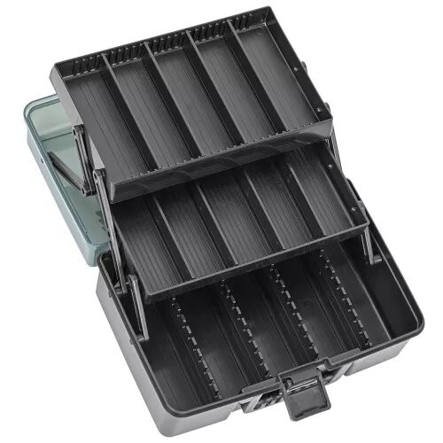 Характеристики: • Цвет: Черный. Meiho VS-7020 - уникальная модель ящика с двумя выдвижными полками, сочетающая в себе оригинальное решение компактности и функциональности в виде чемоданчика и классического ящика с выдвижными полками. Надежная система реек, выполняющая поддержку полок, обеспечивает прочность конструкции с плотным прилеганием полок друг к другу, сохраняя исходное положение приманок и аксессуаров даже при вертикальной носке. Ящик плотно закрывается надежным замком-защелкой. Удобная рифленая углубляющаяся в корпус рукоять выполнена из плотного и упругого пластика обеспечивает комфортный хват даже если ладони влажные. • 2 выдвижных лотка глубиной 28 мм оснащены 4 съемными перегородками для разграничения и конфигурации пространства; • Основное нижнее отделение глубиной 65 мм оснащено 4 съемными перегородками-подставками со специальными отверстиями для фиксации приманок крючками (пилькеры, воблеры и т. д.).