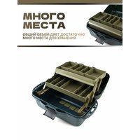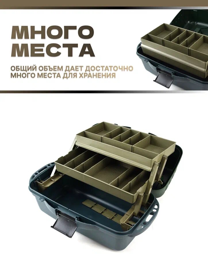 Важным преимуществом ящика является его двухъярусная конструкция. На верхней полке можно разместить самые необходимые предметы, которые должны быть под рукой, а нижняя полка идеально подходит для хранения крупных предметов, таких как катушки, лески и поплавки.