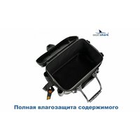 Полная влагозащита содержимого. Ящик имеет крепкий плечевой ремень, а так же надежные пластиковые ручки для транспортировки. 4 держателя под удилища на боковой части ящика.