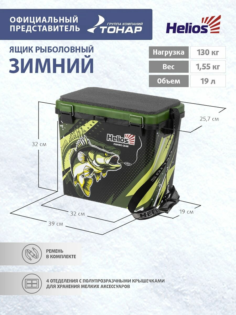 Ящик рыболовный зимний односекционный торговой марки Helios, изготовленный из ударопрочного, морозостойкого и в то же время легкого пластика, обеспечивает надежное хранение и транспортировку рыболовных снастей.